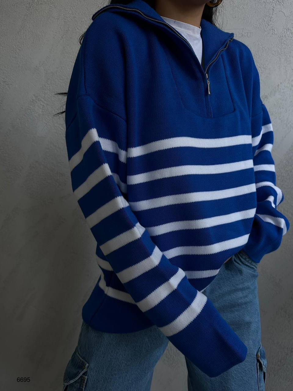 Çizgili Fermuarlı Saks Triko Kazak