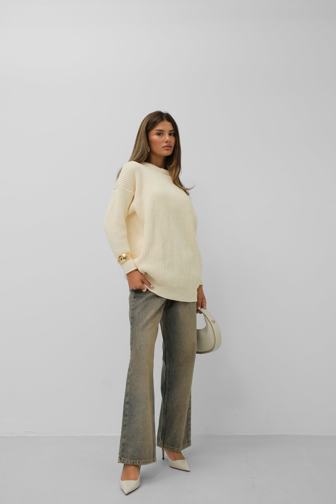 Oversize Örgü Ekru Kazak