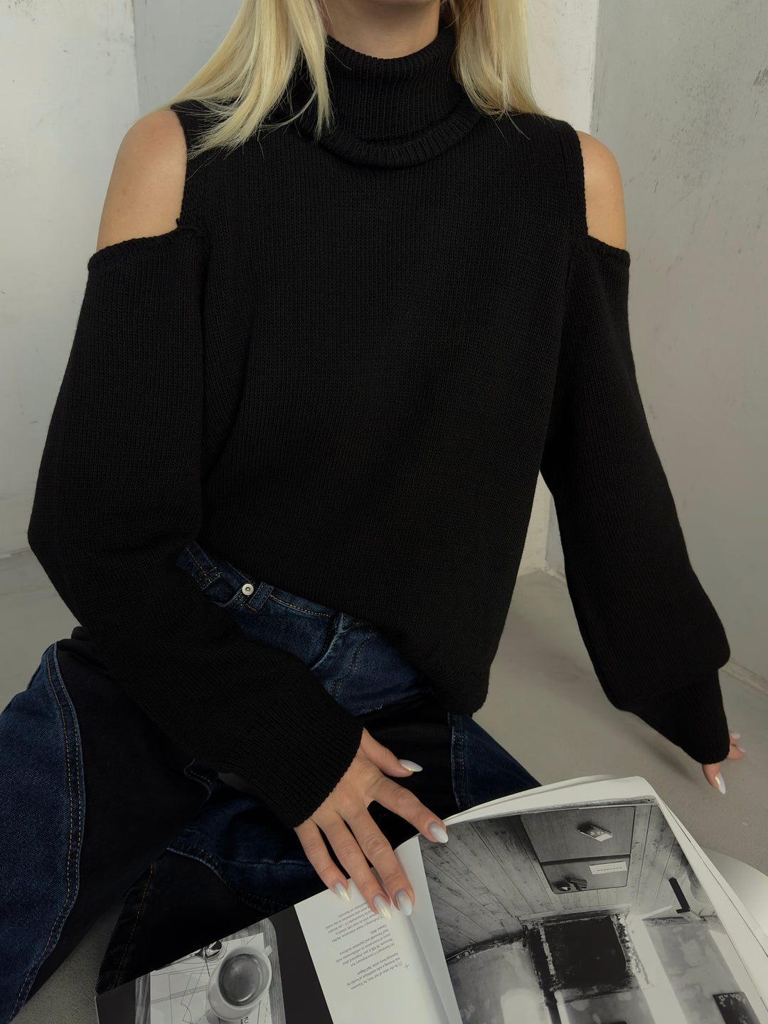 Omuz Detay Balıkçı Yaka Siyah Kazak