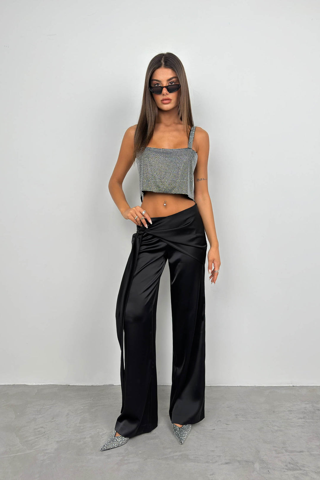 Asimetrik Bağlamalı Tek Omuz Siyah Crop