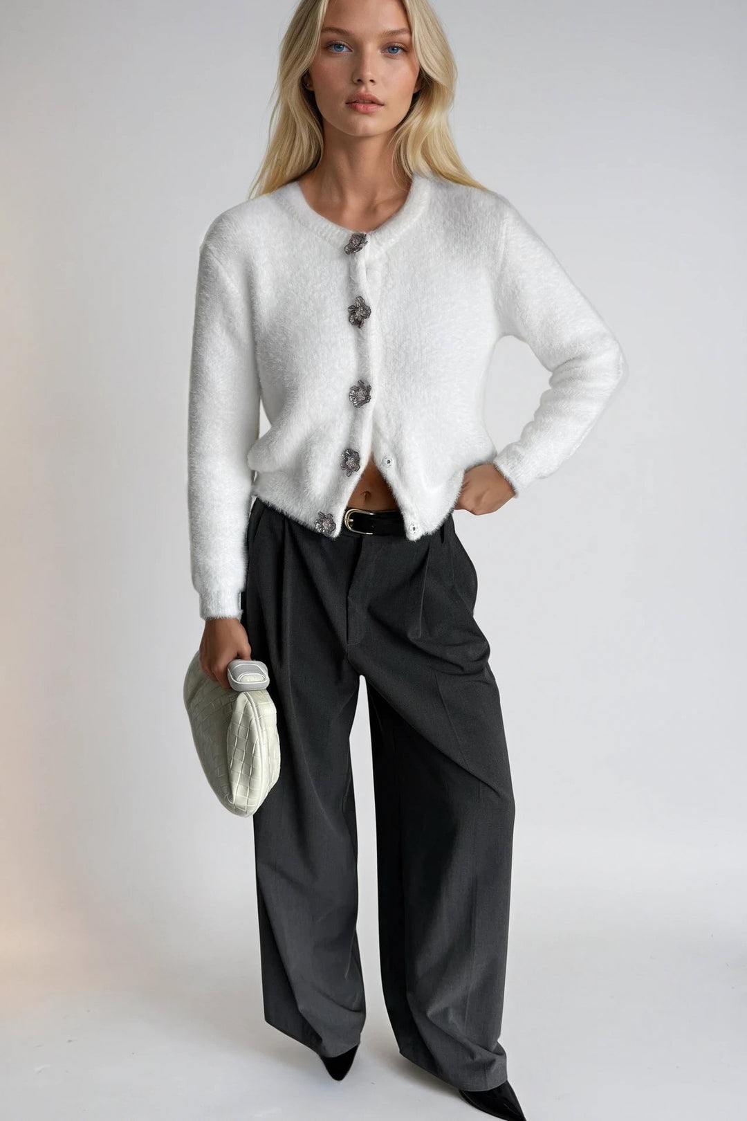 Çiçek Aksesuarlı Yumuşak Dokulu Ekru Triko Hırka
