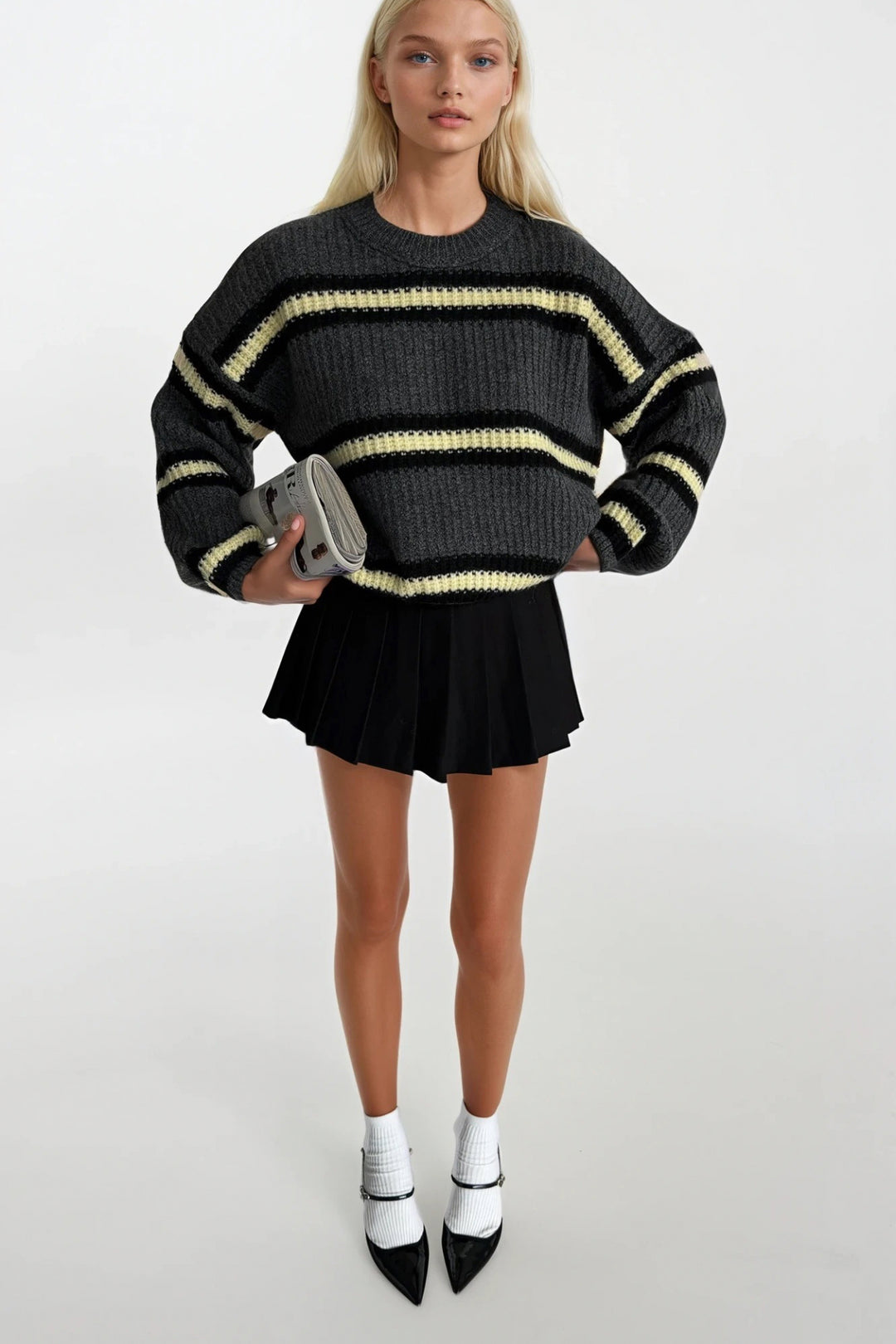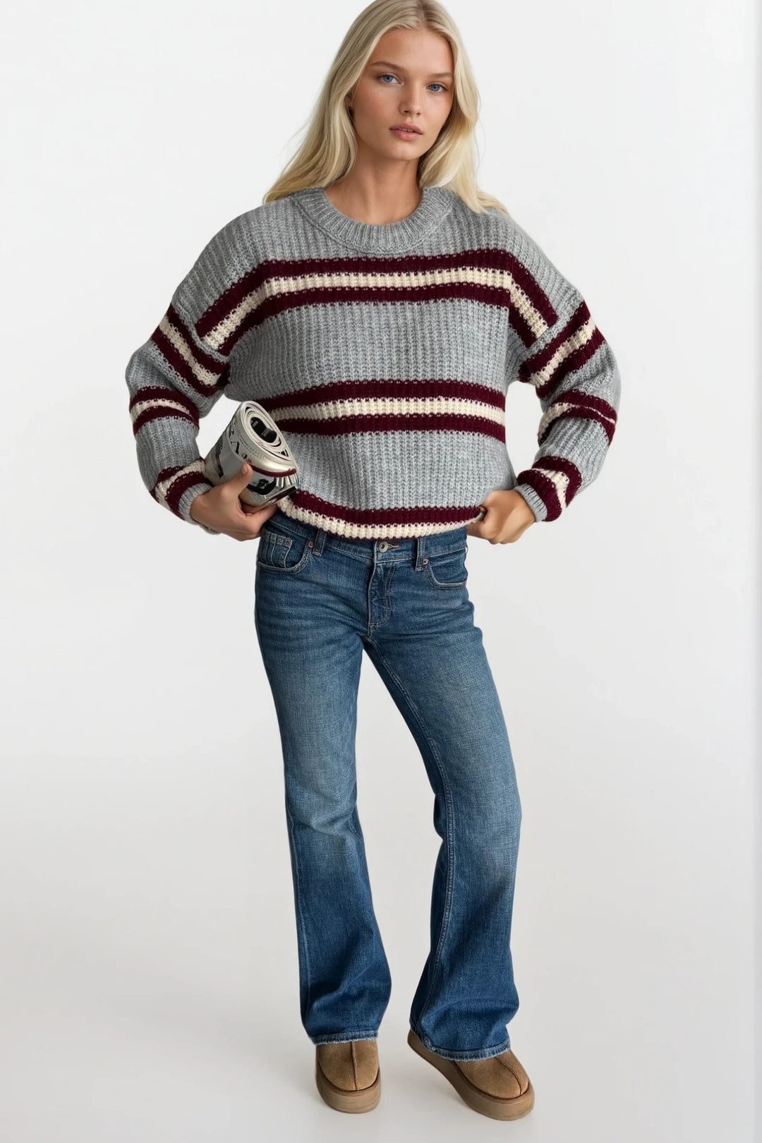 Çizgili Bisiklet Yaka Gri Triko Kazak