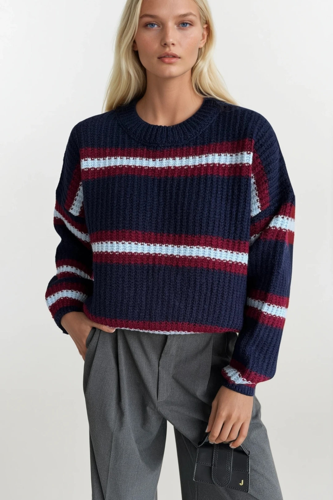 Çizgili Bisiklet Yaka Lacivert Triko Kazak