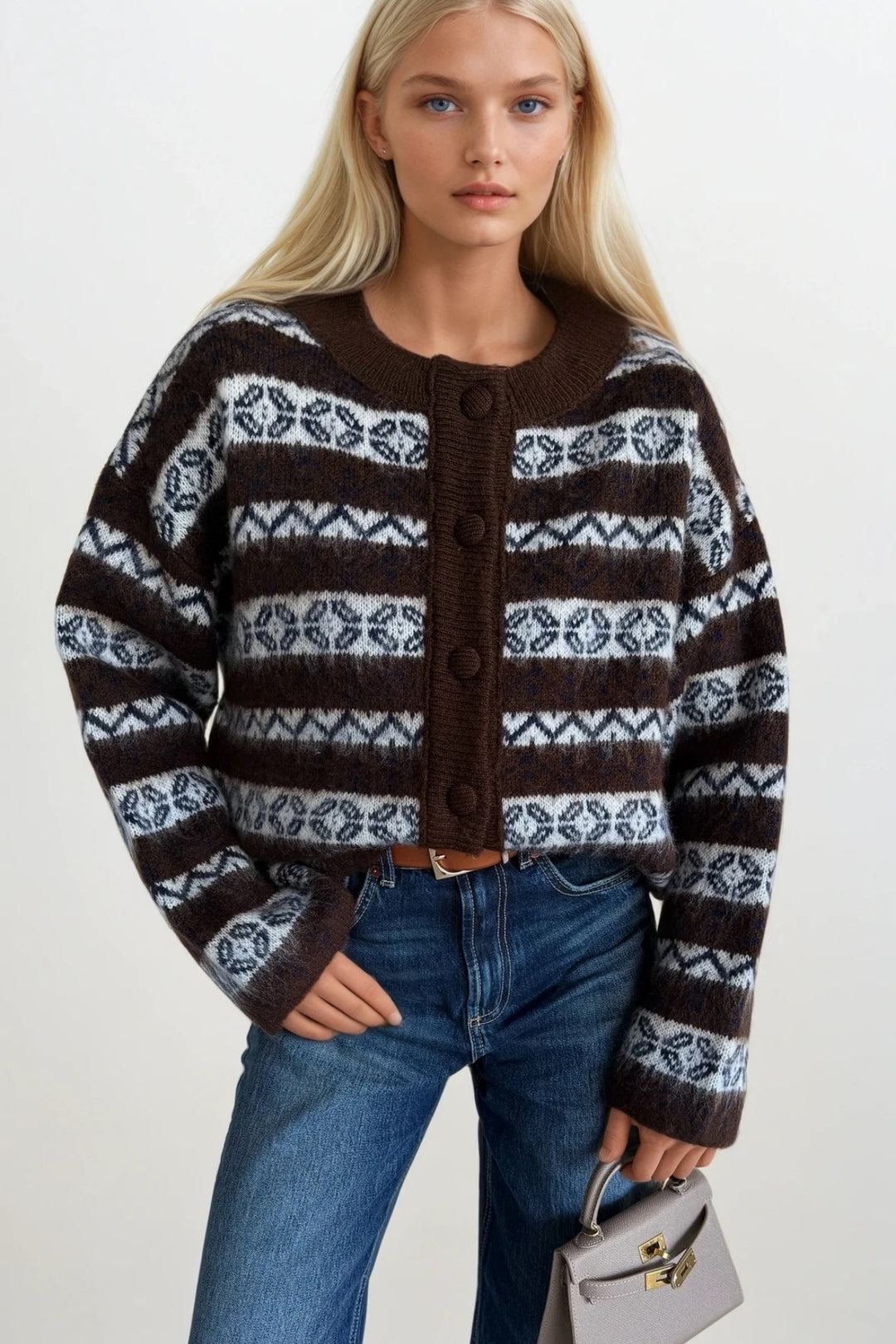 Etnik Desen Kahverengi Şardonlu Triko Hırka