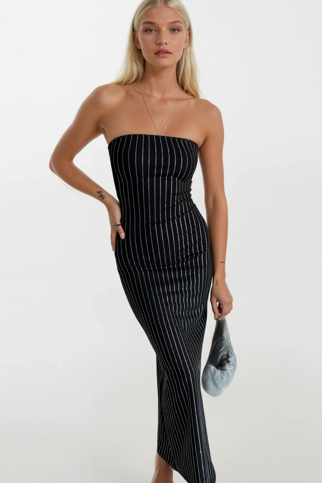 Taş İşlemeli Siyah Straplez Maxi Elbise