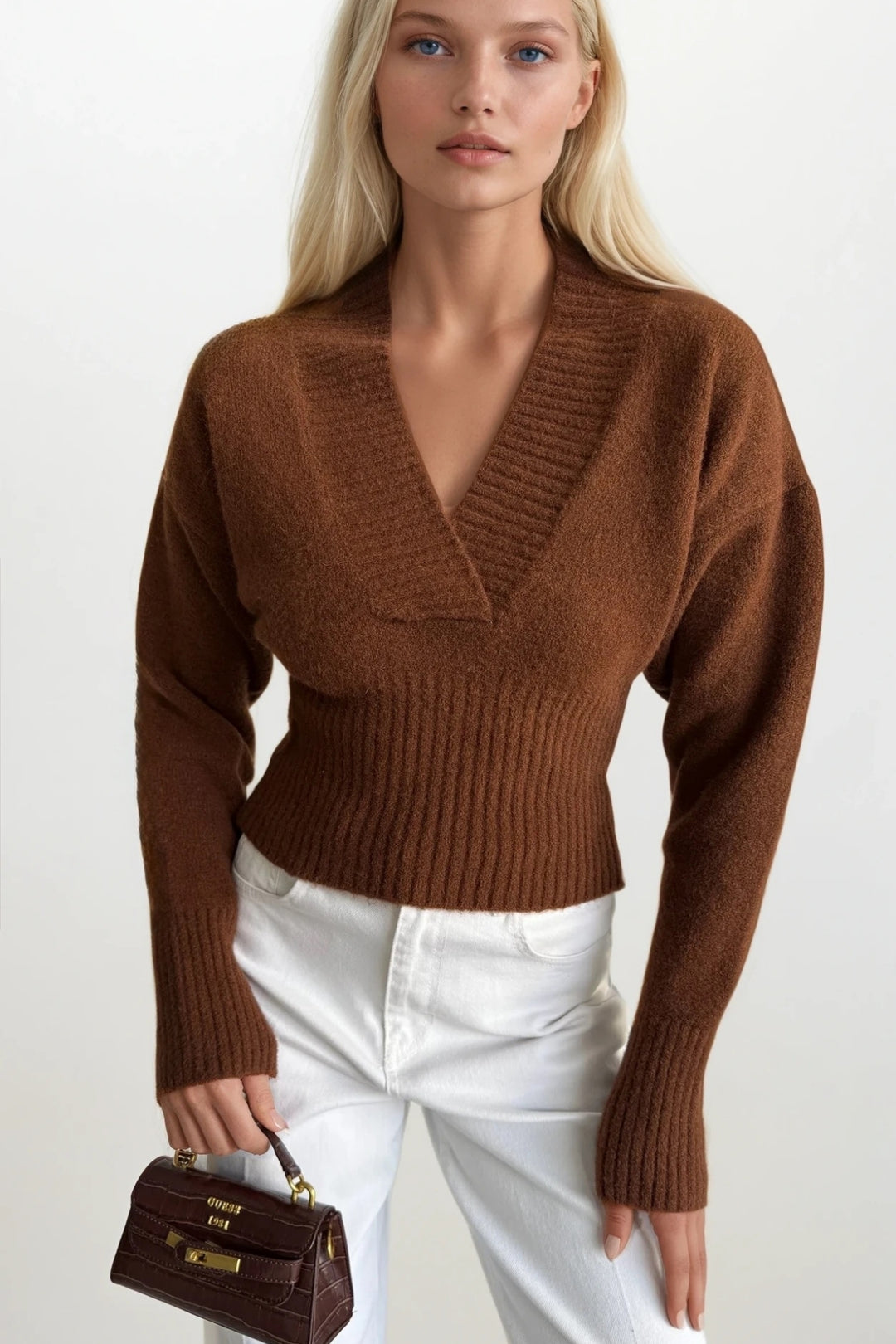 V Yaka Bel Oturtmalı Kahverengi Triko Kazak