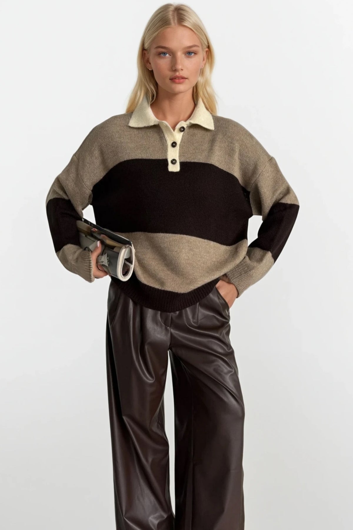 Çizgili Polo Yaka Kahverengi Yumoş Triko Hırka