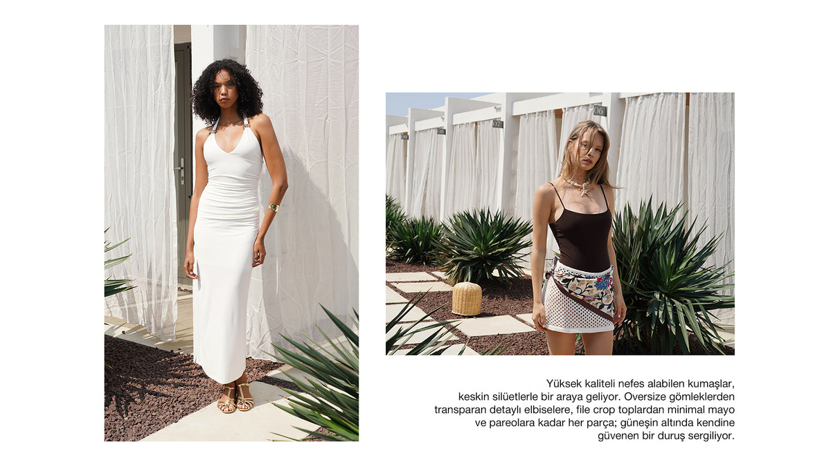 Patterned bikini sets or bohemian kimonos are ideal for beach club outfits. Highlight your style with minimal jewelry.