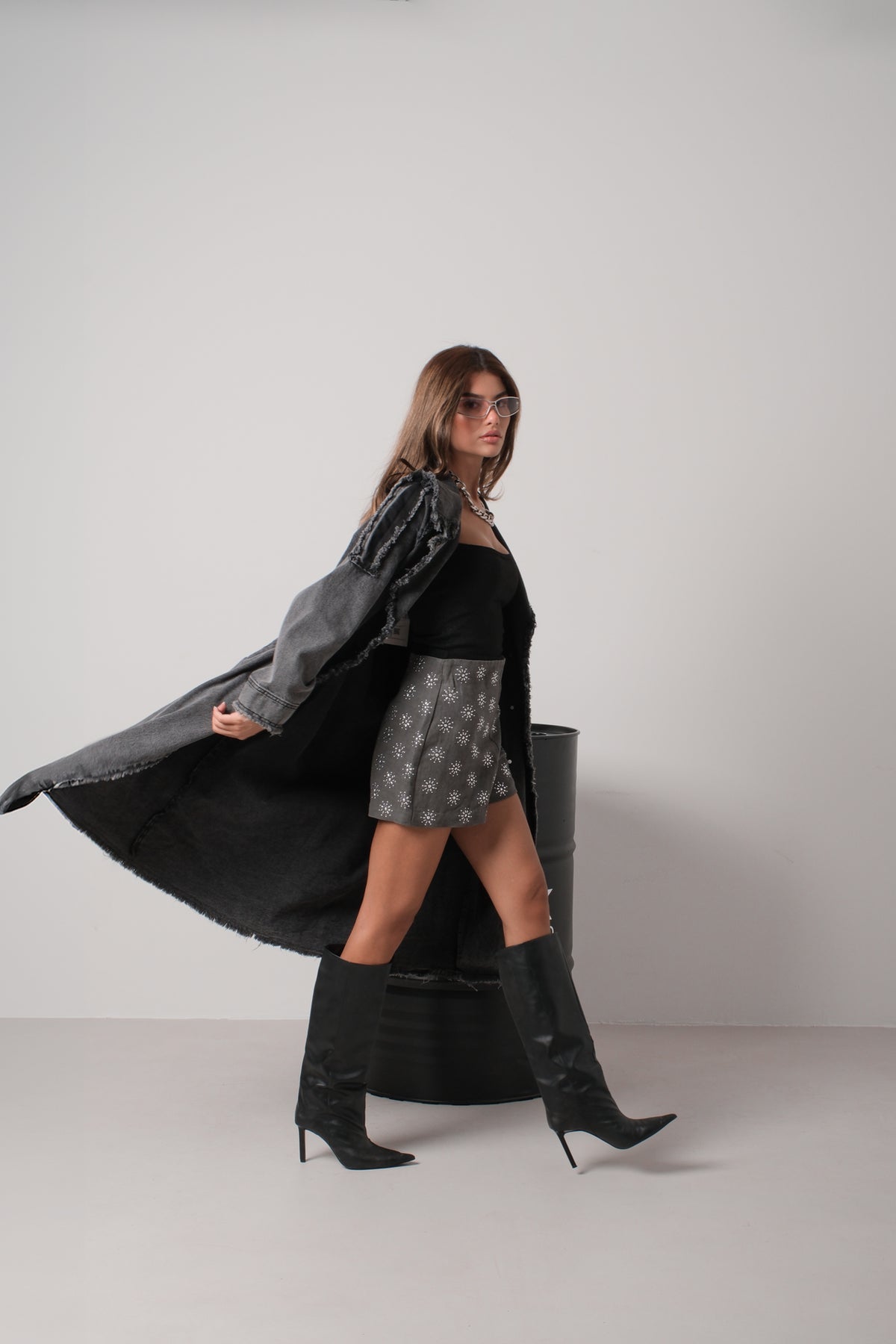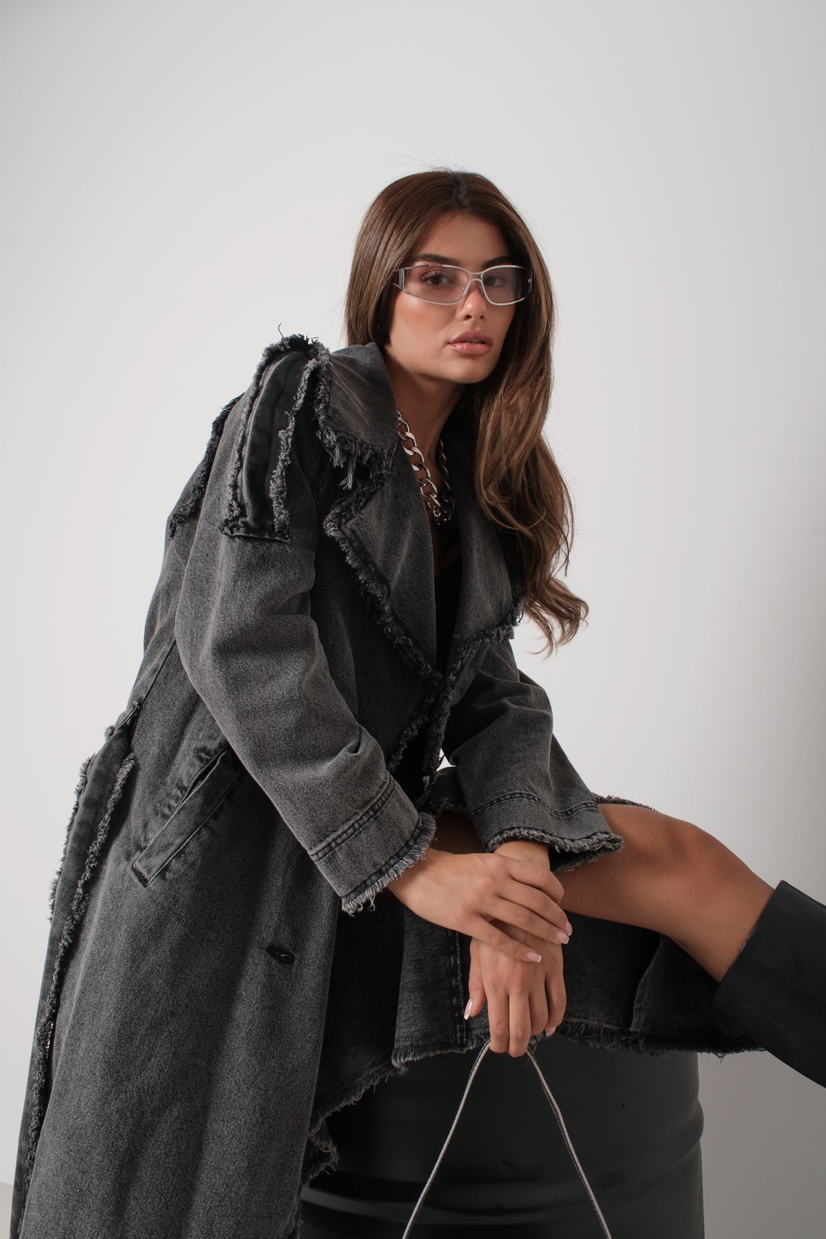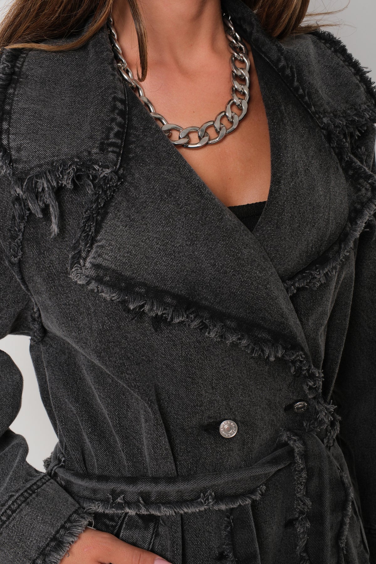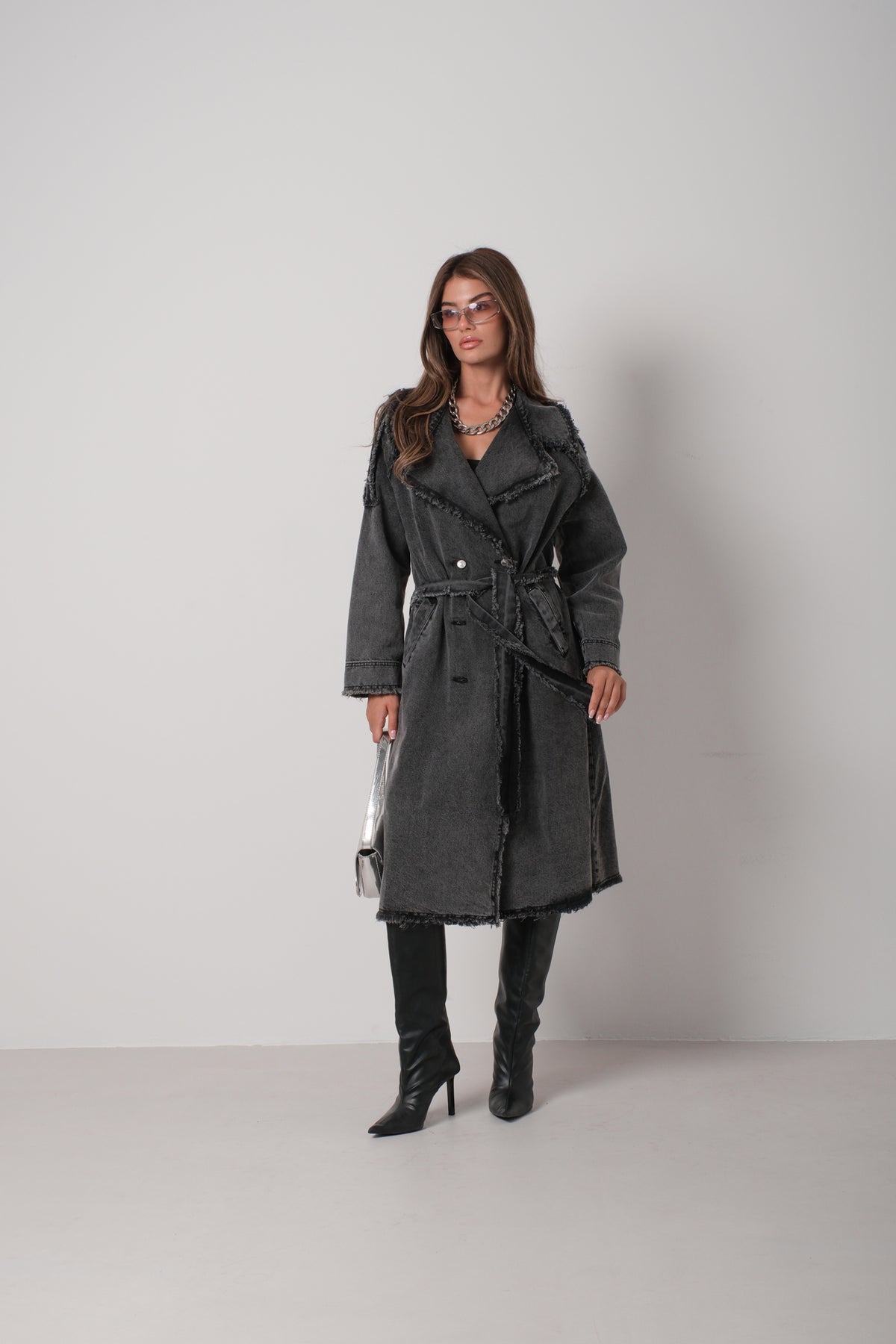 Tassel Detail, Denim Midi Length, Trench Coat, Fold-down Collar, Belted, Long, Jacket