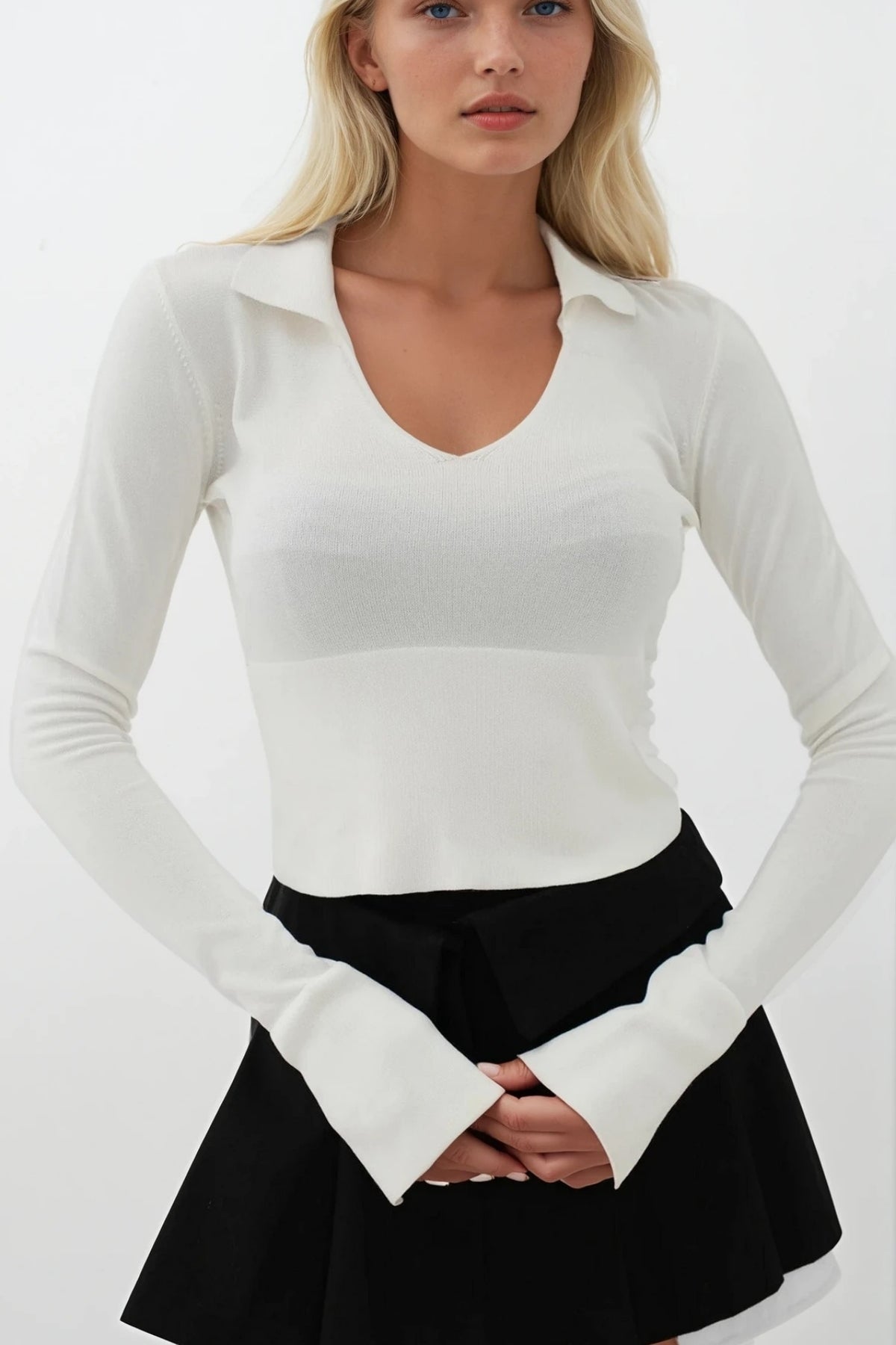 V-Neck, Bodice Detail, Long Sleeve, Crop, U-Neck, Knitwear Blouse