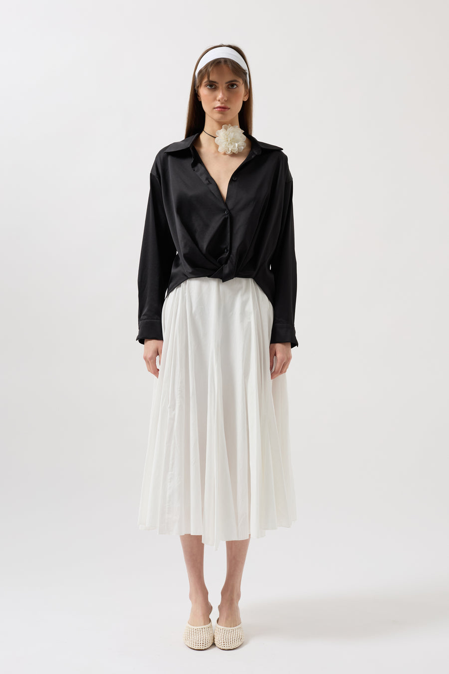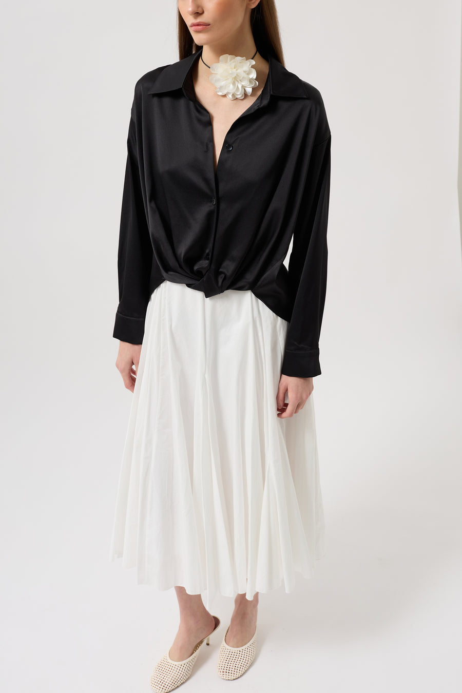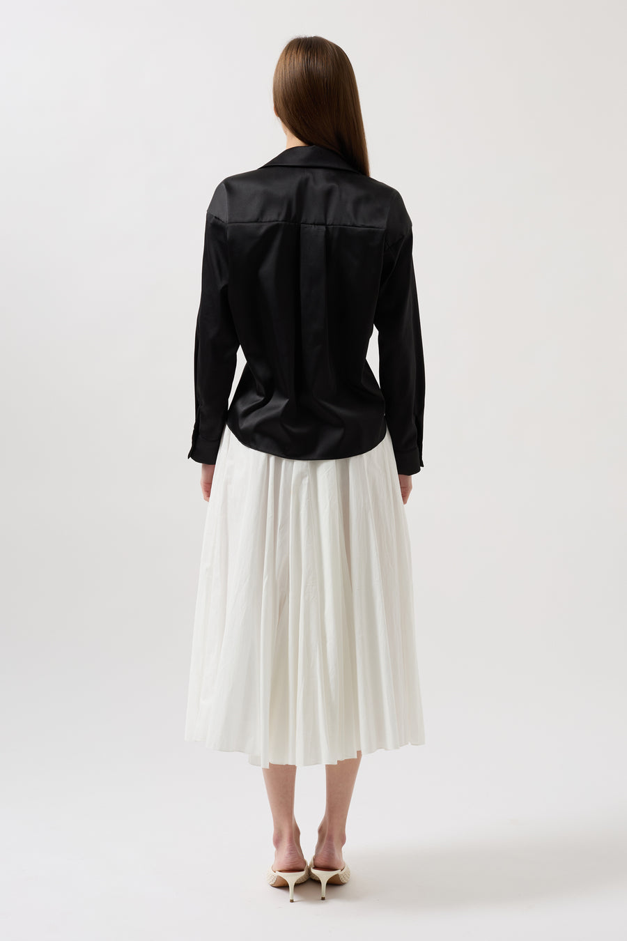 Pair satin or patterned shirts with midi skirts for a striking evening look. Complete your look with minimal jewelry.