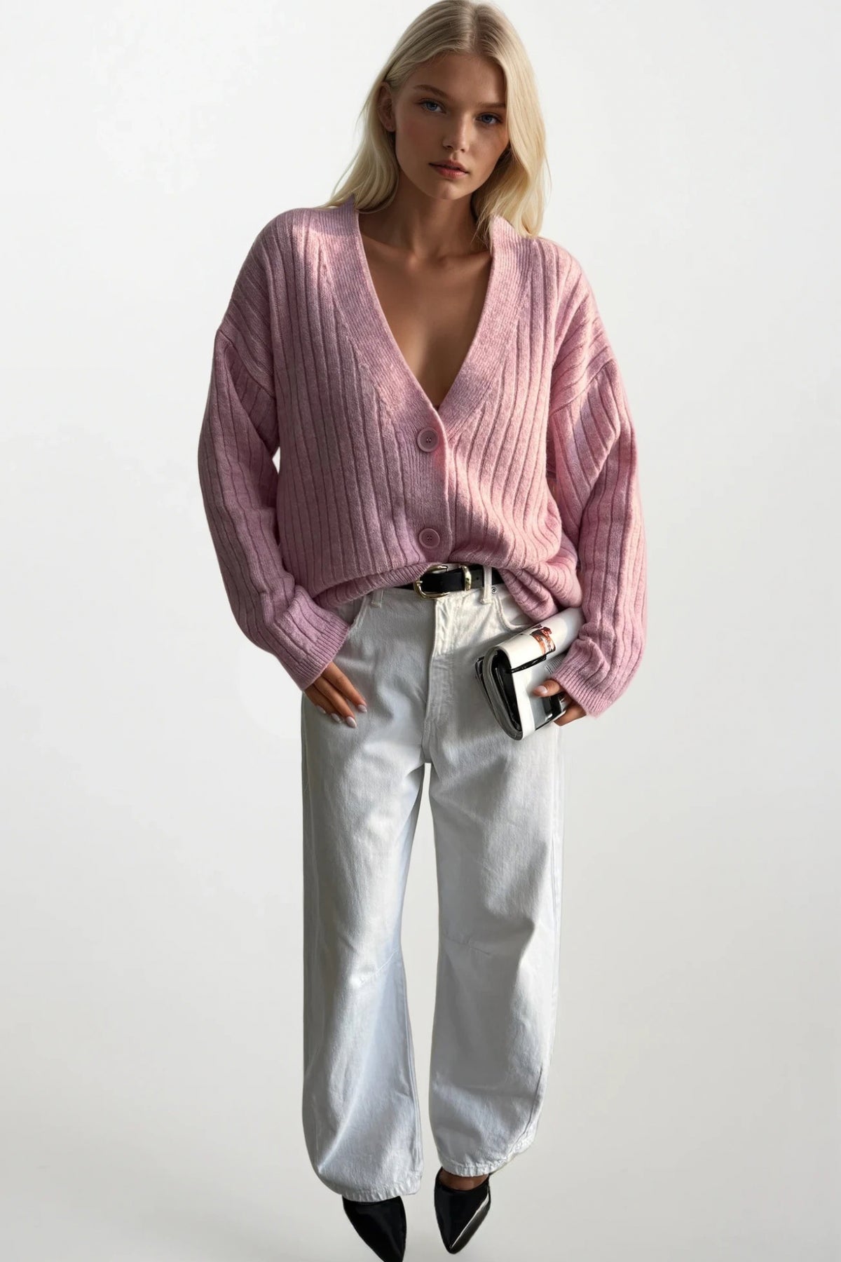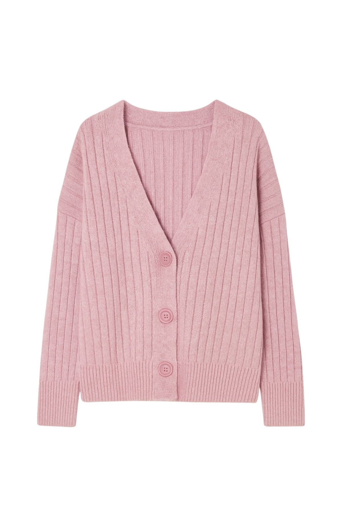 Düğmeli V Yaka Pembe Triko Hırka