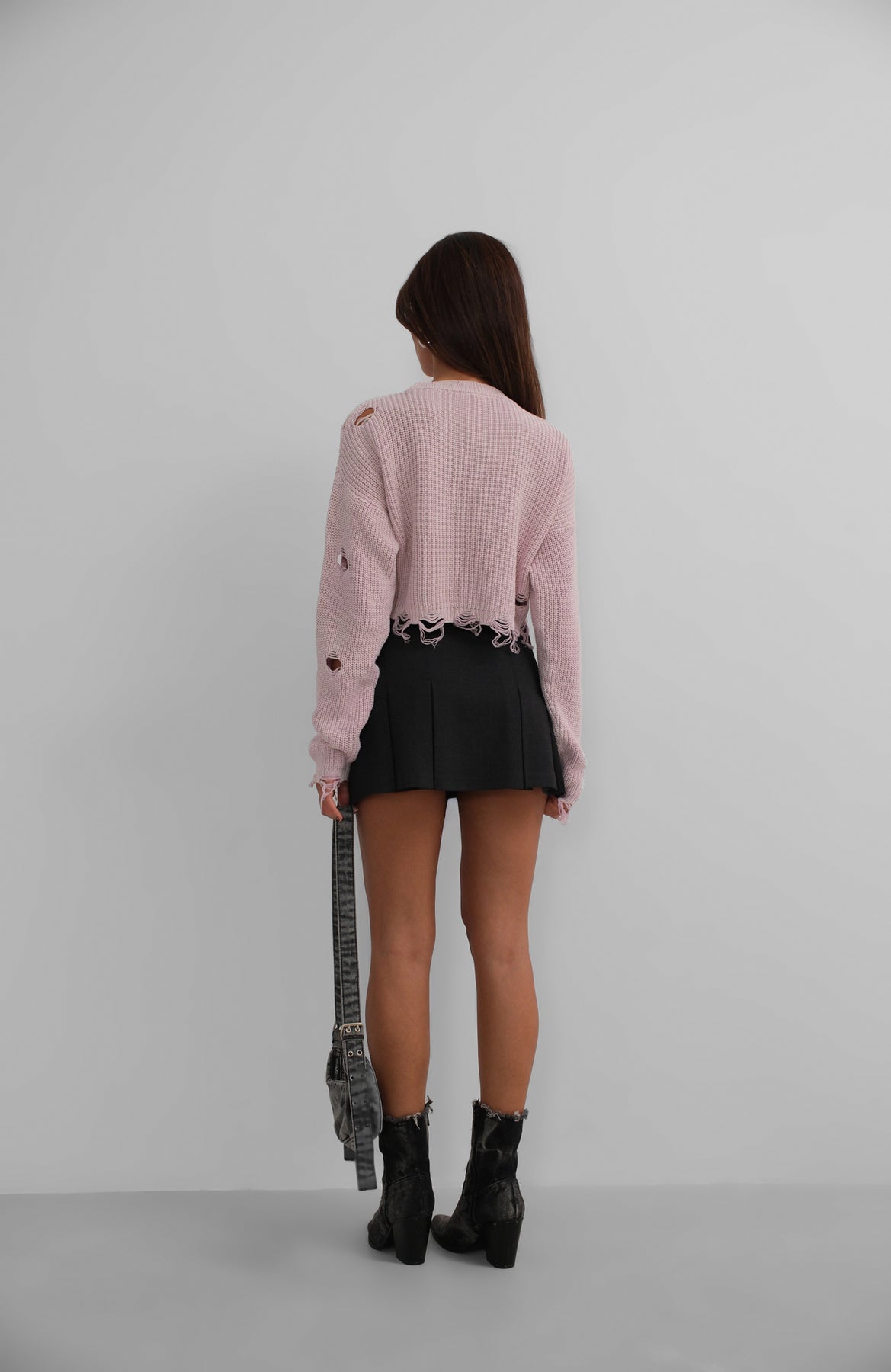 Embroidered, Washed Crop Knit Sweater with Tassel and Ripped Details