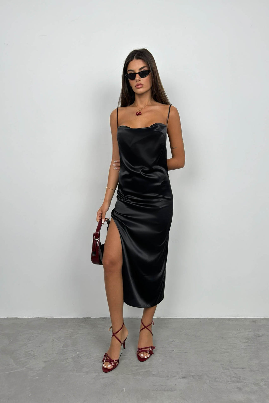 Piping Detail Strappy Sweetheart Neck Black Dress