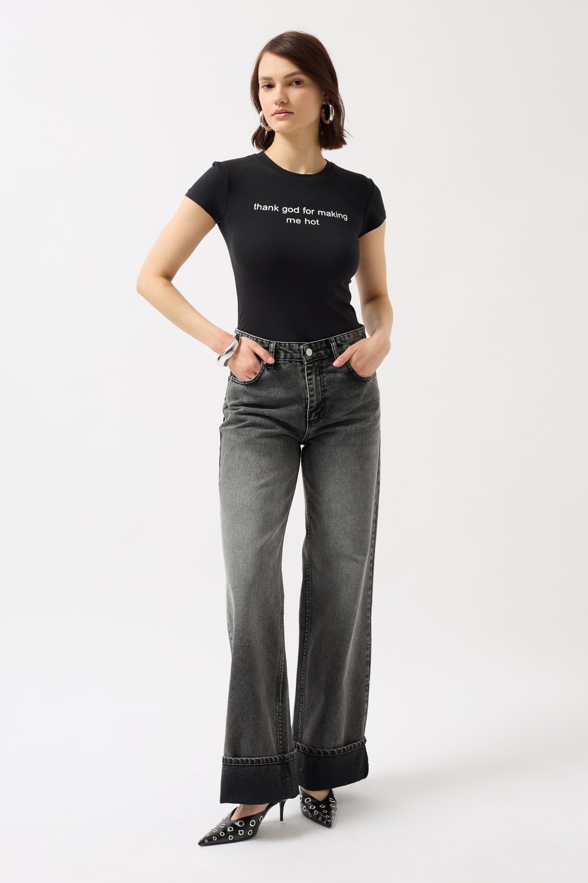 Thank God Printed Lycra Crop Black T-Shirt