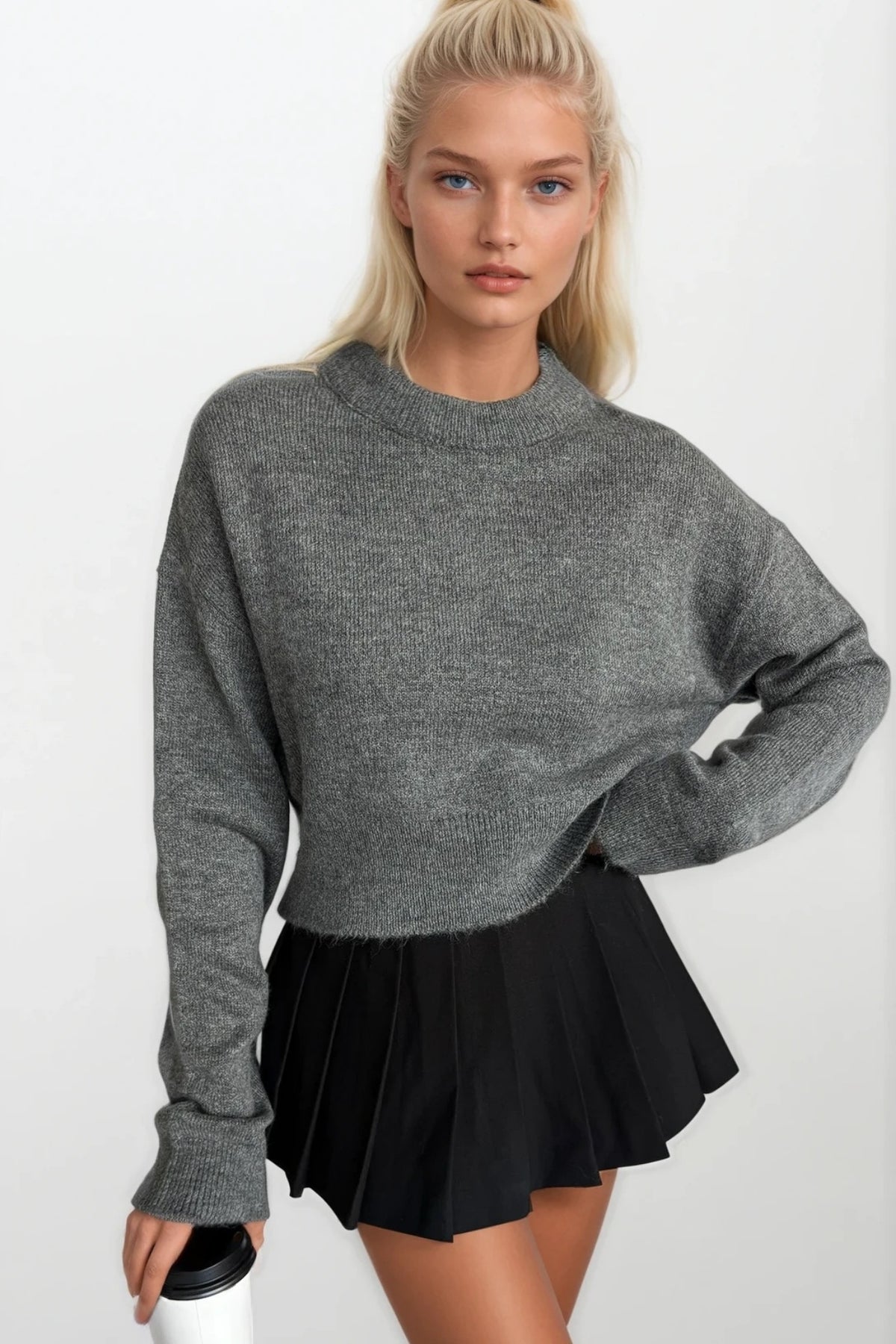 Bisiklet Yaka Crop Antrasit Triko Kazak