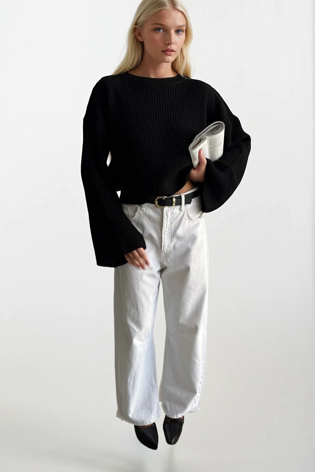 Bisiklet Yaka Örgü Detay Crop Triko Siyah Kazak