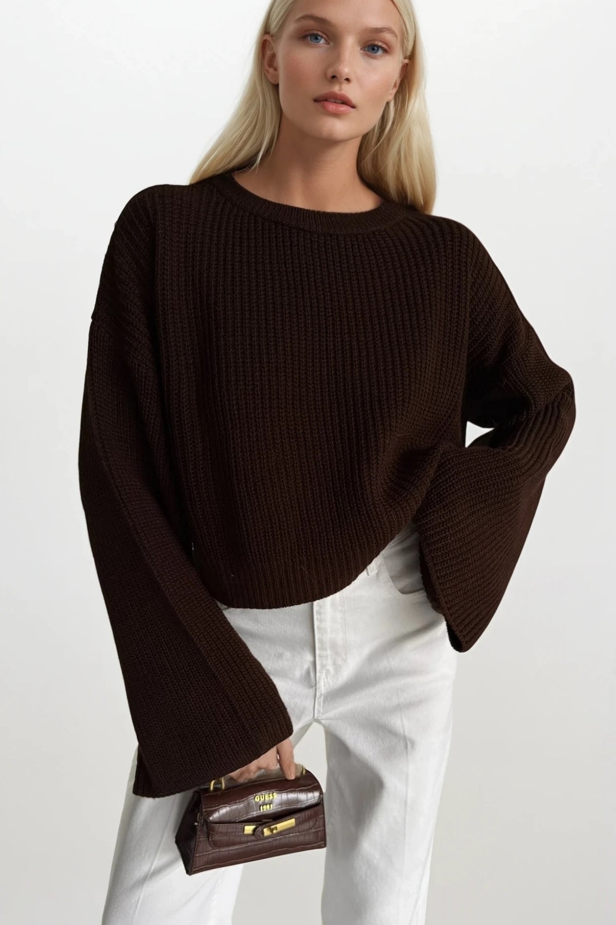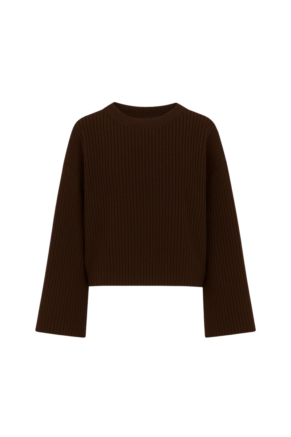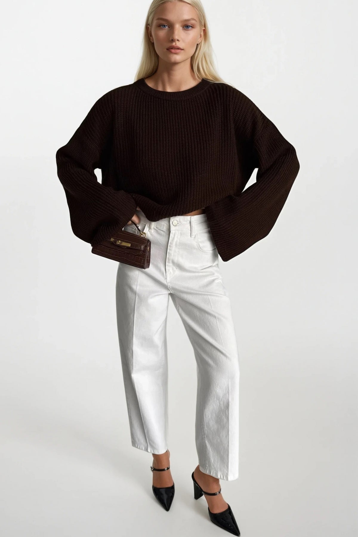 Bisiklet Yaka Örgü Detay Kahverengi Crop Triko Kazak