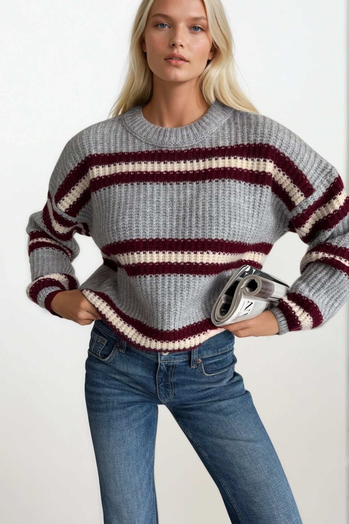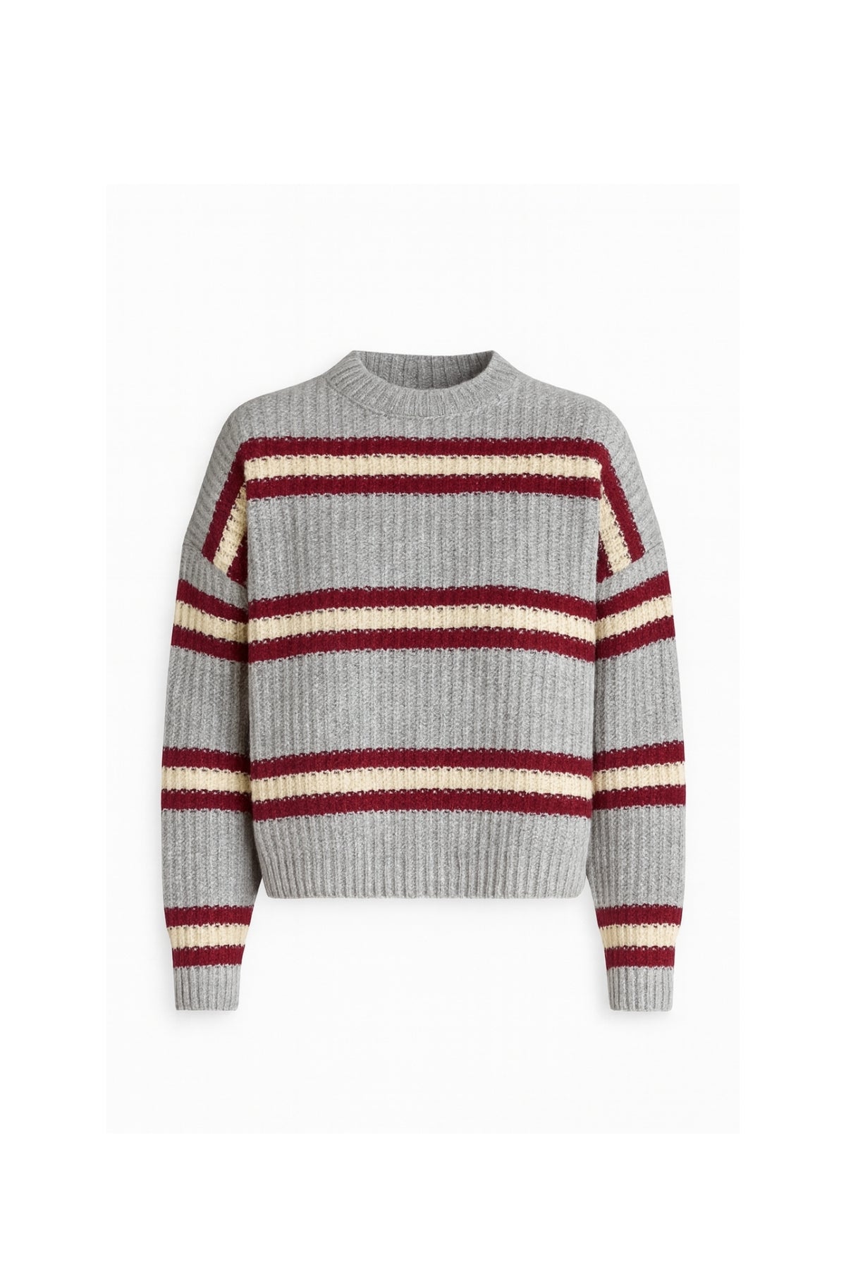 Çizgili Bisiklet Yaka Gri Triko Kazak