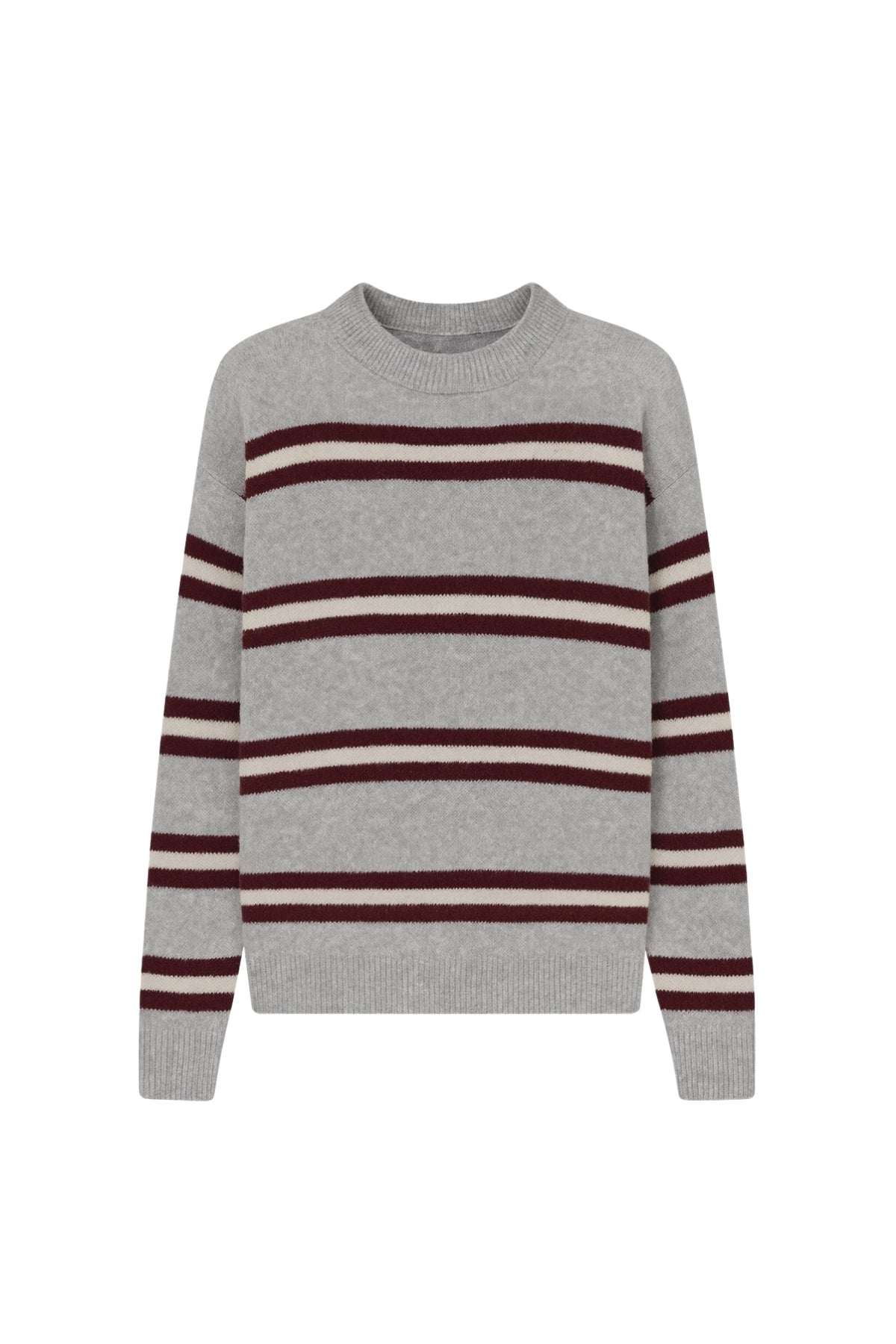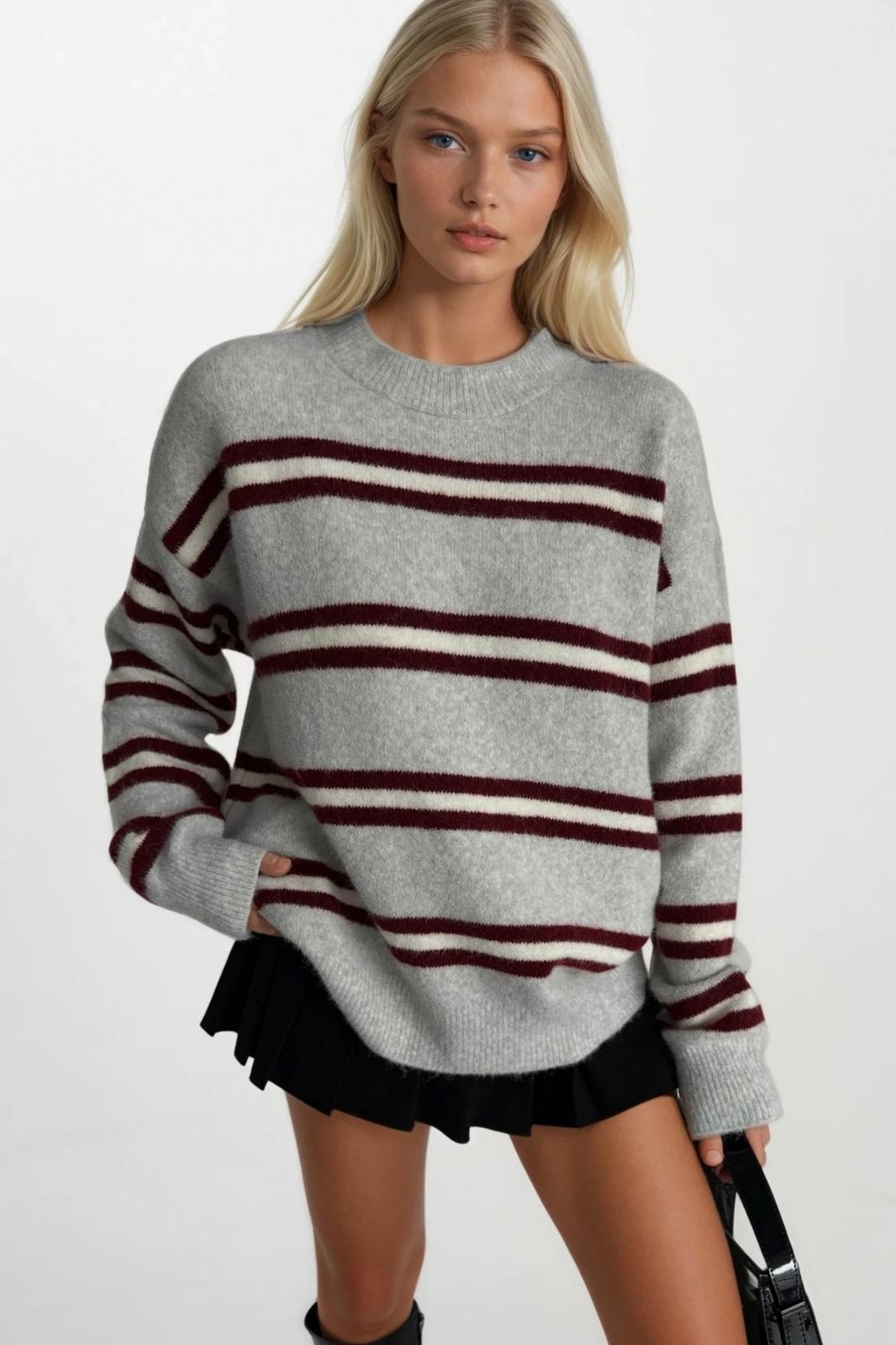Çizgili Bisiklet Yaka Oversize Triko Gri Kazak