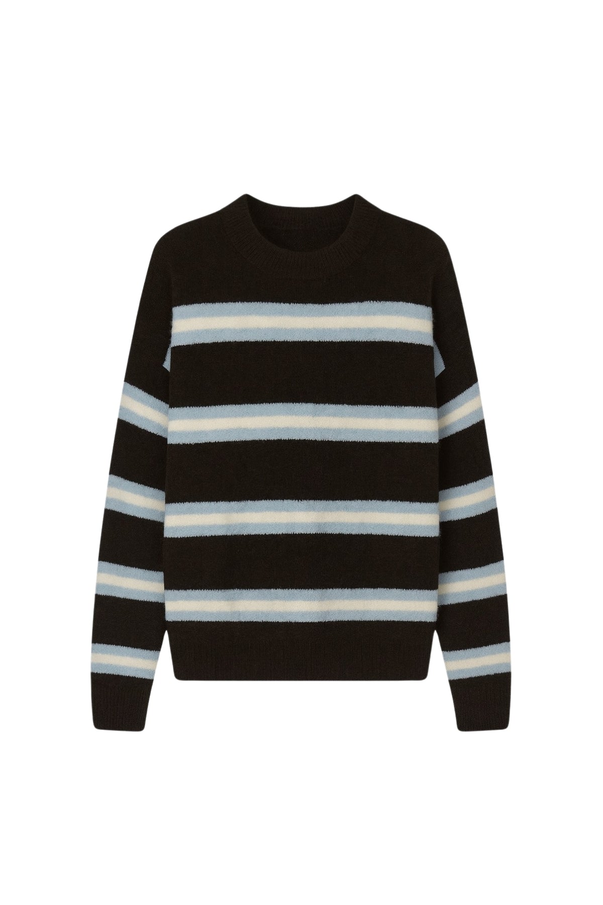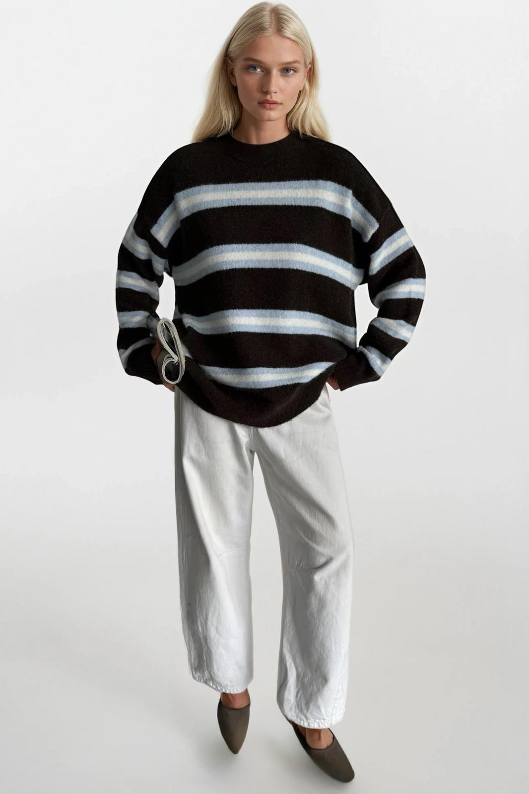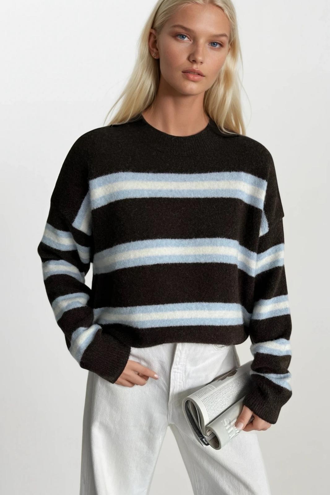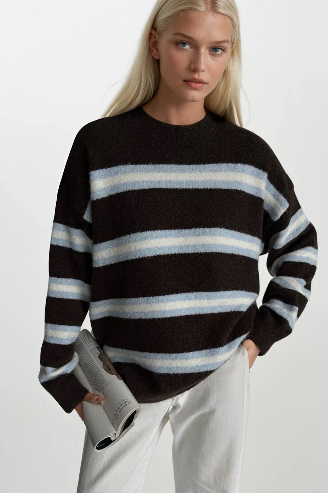 Çizgili Bisiklet Yaka Oversize Triko Kahverengi Kazak