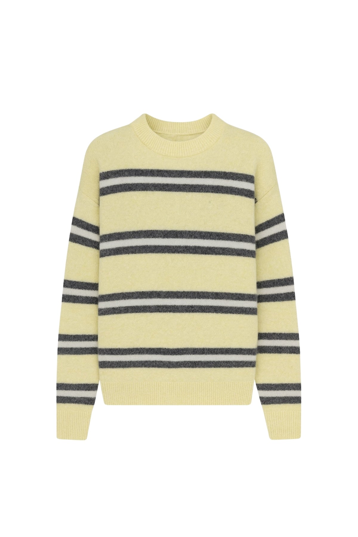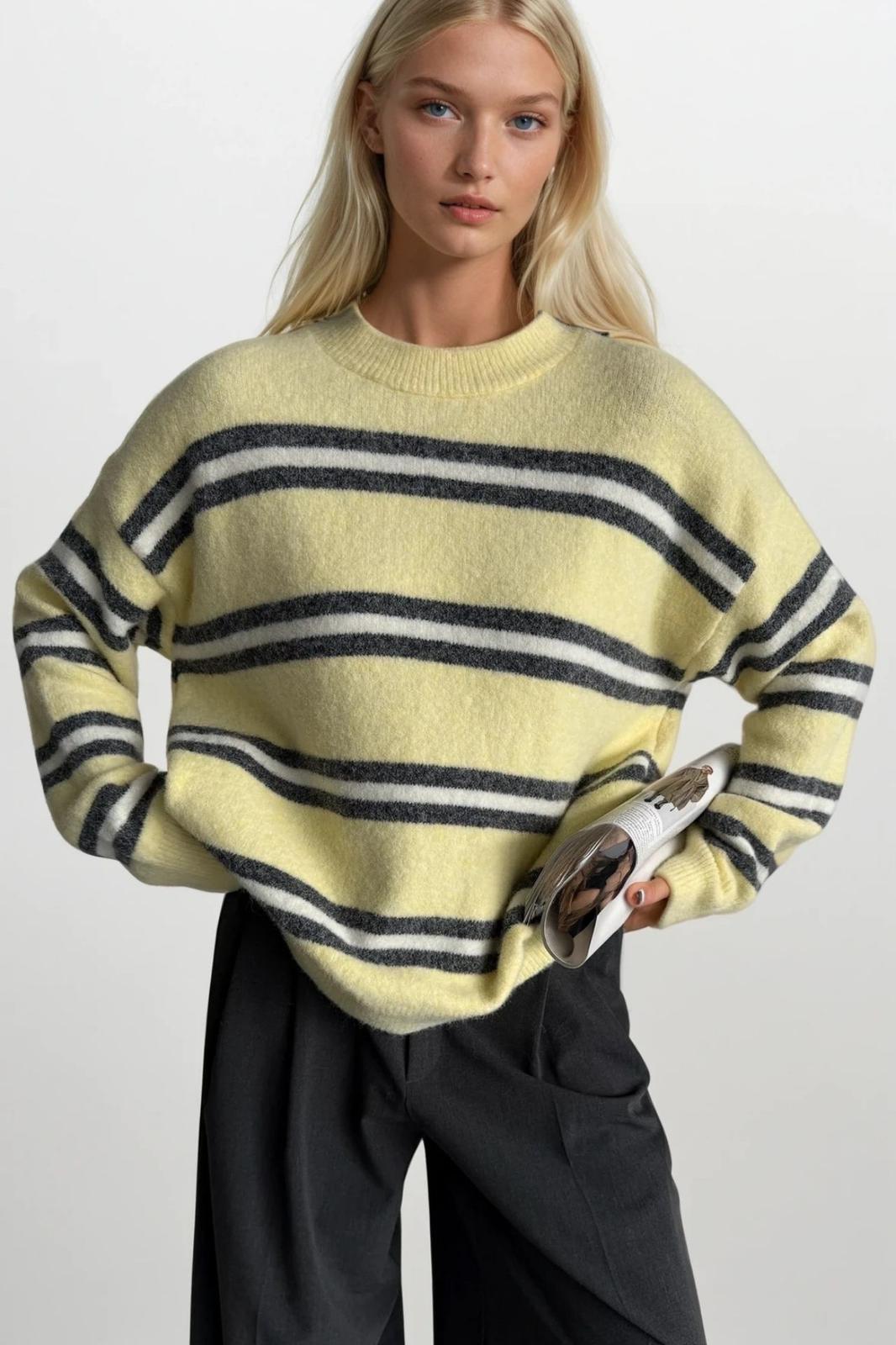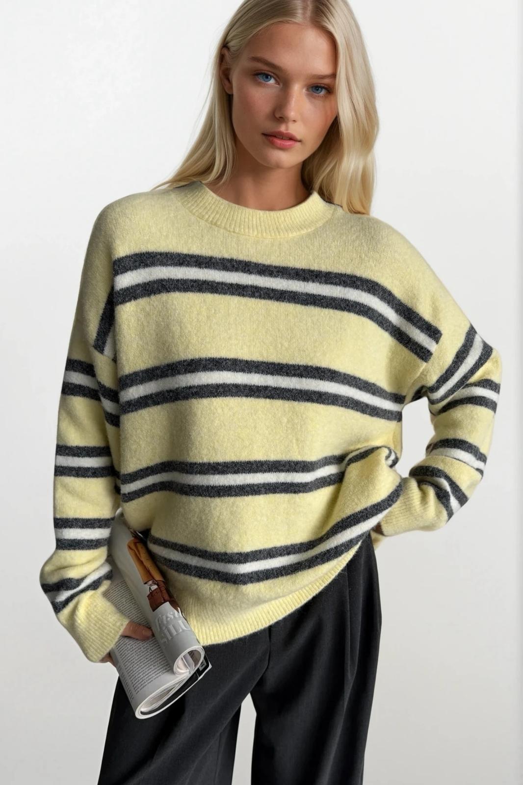 Çizgili Bisiklet Yaka Oversize Triko Sarı Kazak