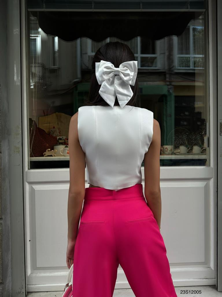Button Detailed, Darted, Crop Vest Sleeveless, Matching Color Fabric, Fake Front Pockets, Deep V Cut, Halter Neck, Buttoned Front.