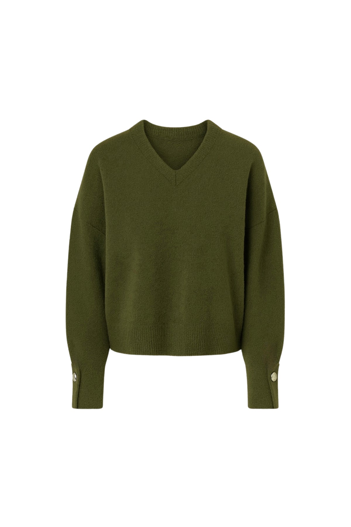 V Yaka Manşet Aksesuar Detay Haki Triko Kazak