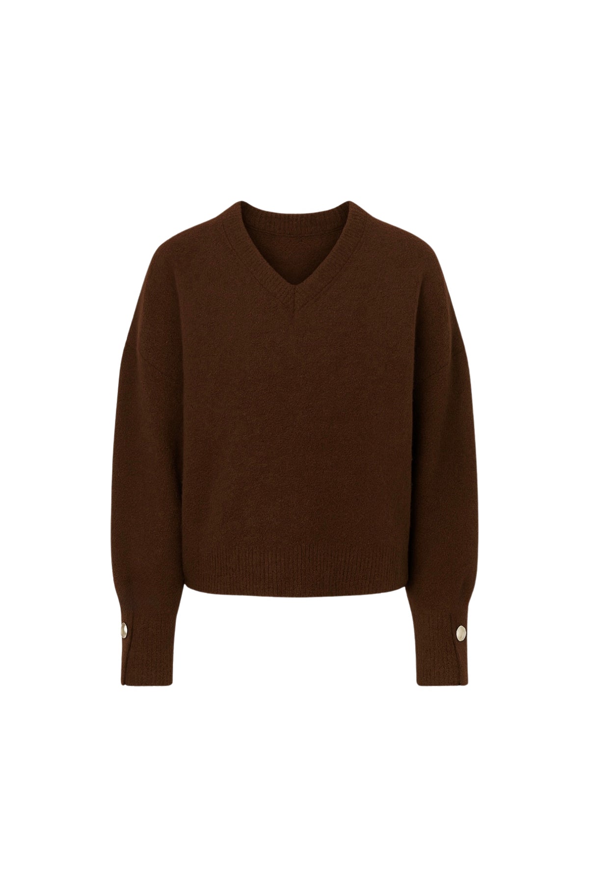 V Yaka Manşet Aksesuar Detay Kahverengi Triko Kazak