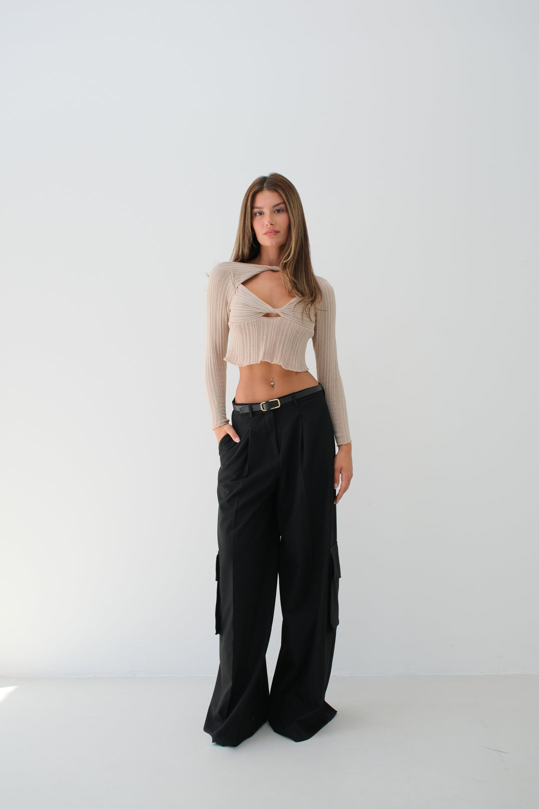 Gathered Beige Cutout Beige Blouse
