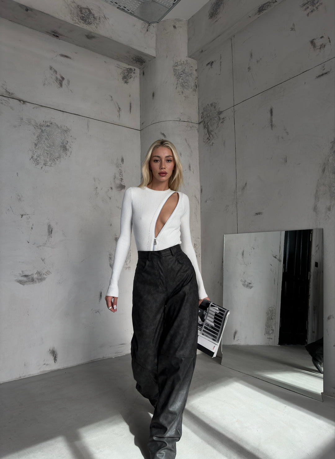 Zipper Detail White Knit Blouse