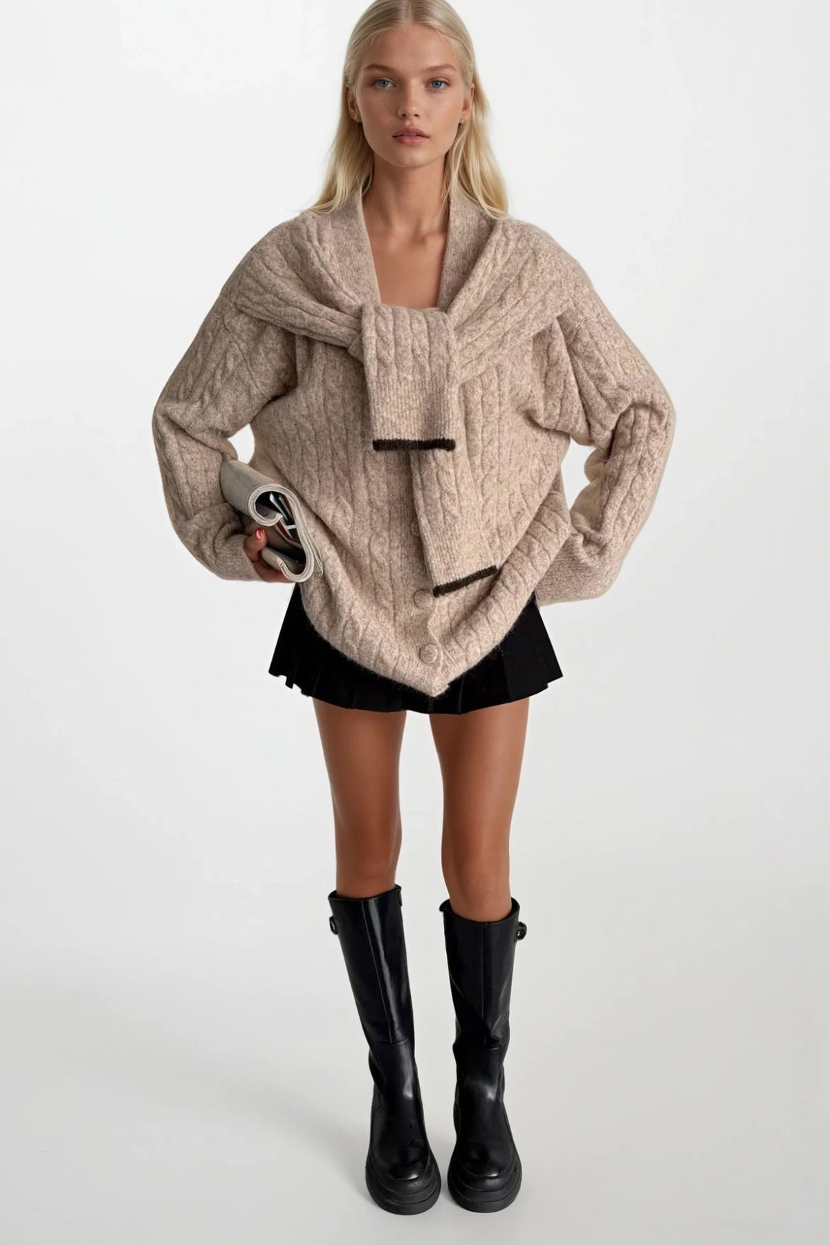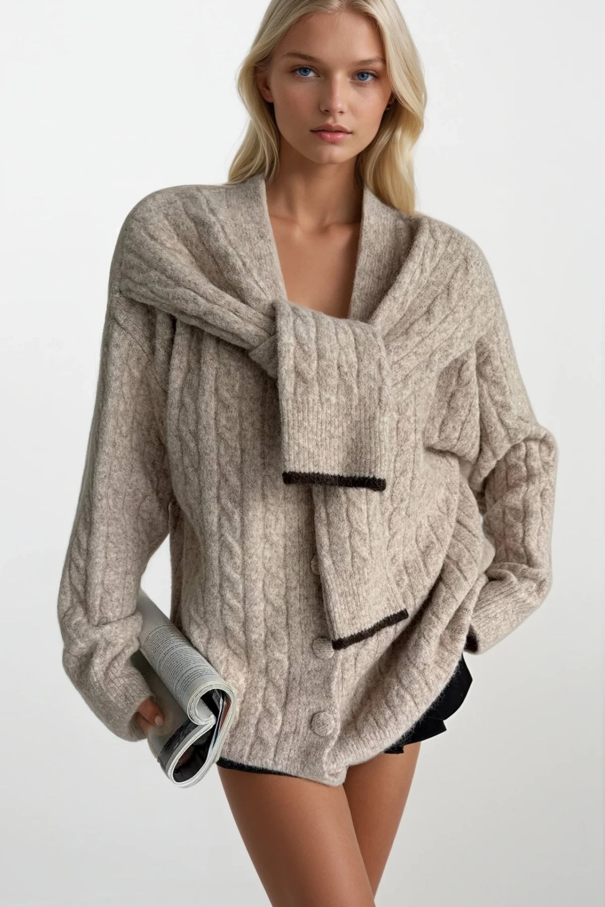 Aksesuar Detay Örgülü Bej Triko Hırka