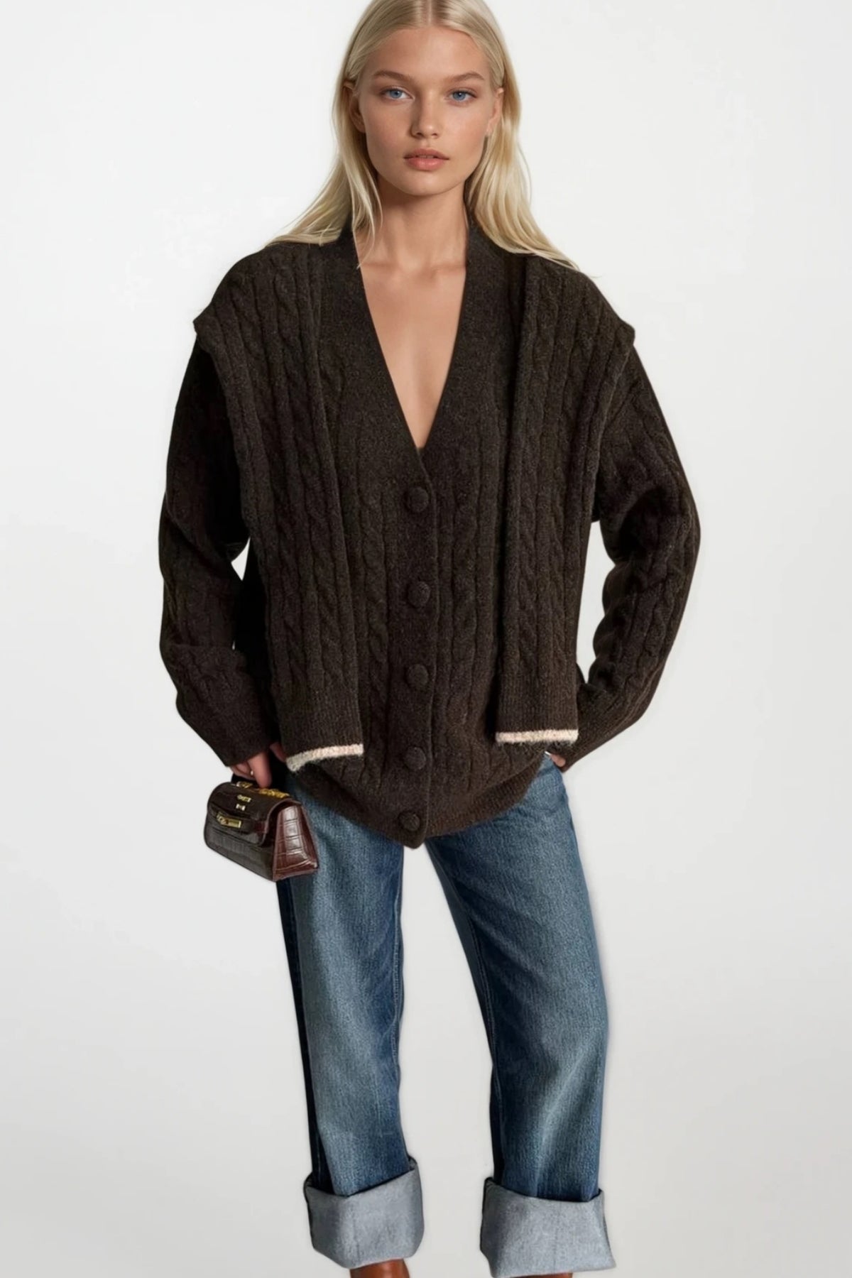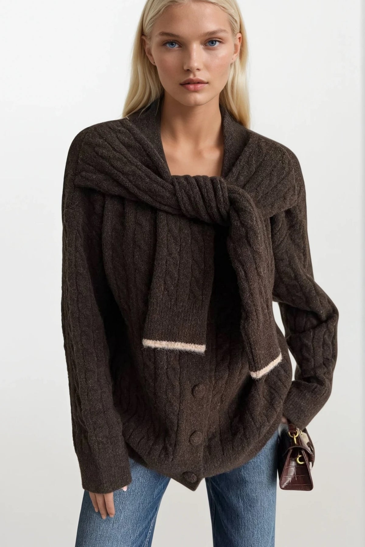 Aksesuar Detay Örgülü Kahve Triko Hırka