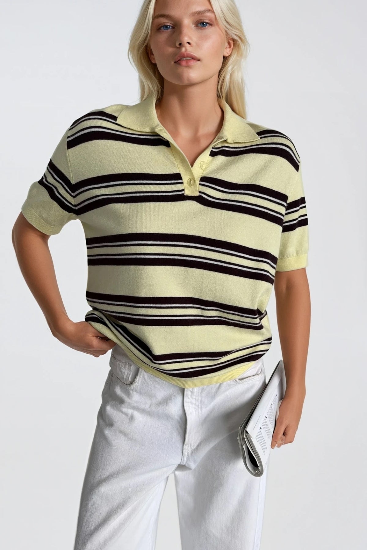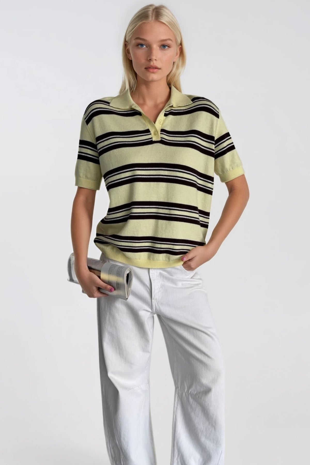 Çizgili Polo Yaka Sarı Triko Bluz ile gardırobunuza zamansız bir şıklık katın. Modern çizgi detayları ve canlı sarı rengiyle dikkat çeken bu triko bluz, hem günlük hem de özel günlerde rahatlıkla tercih edebileceğiniz sofistike bir parça.