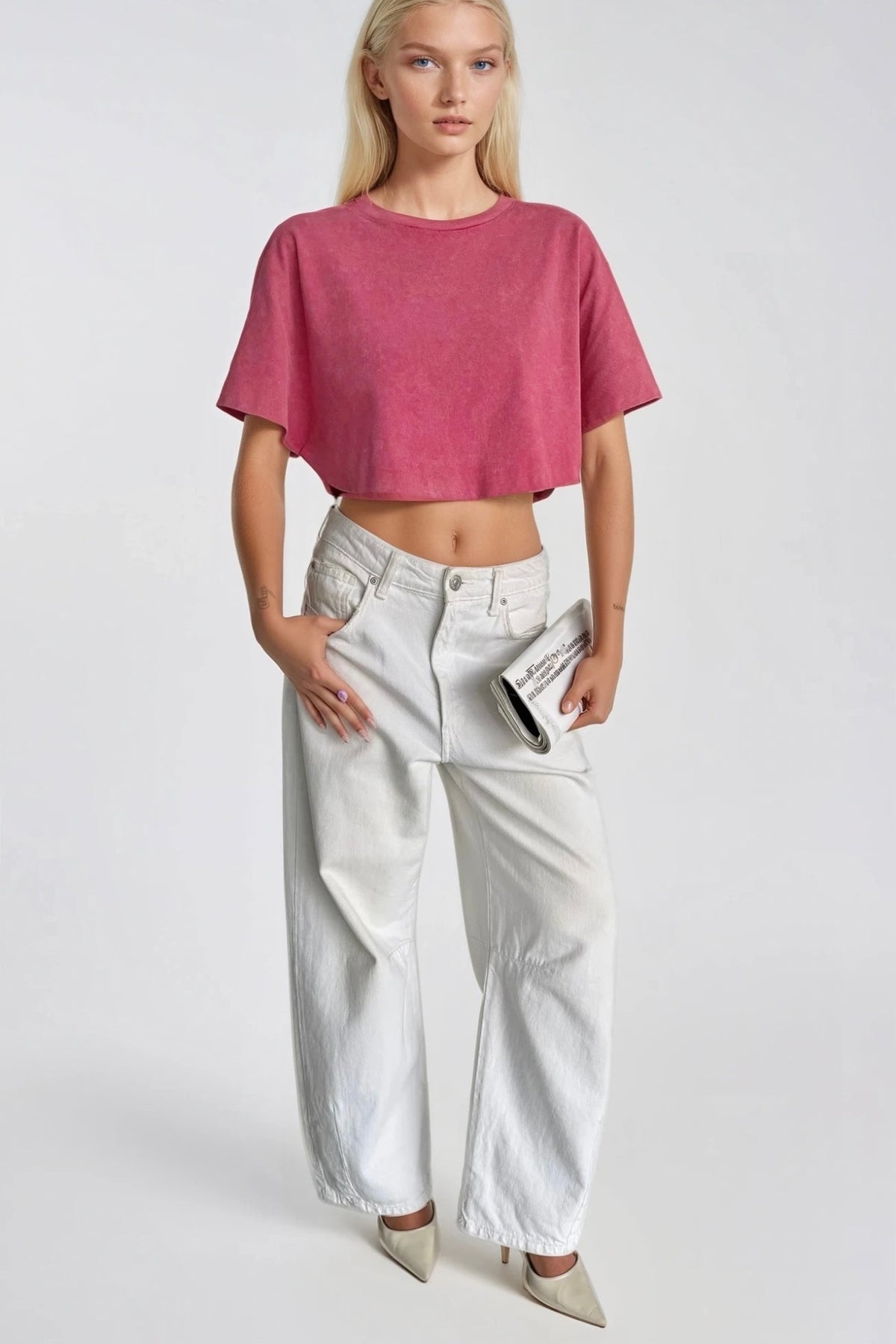 Sofistike renk paleti ile zamansız tasarım. Yıkama efektli pembe crop tişört, modern gardırobunuzun vazgeçilmez parçası olmaya aday.