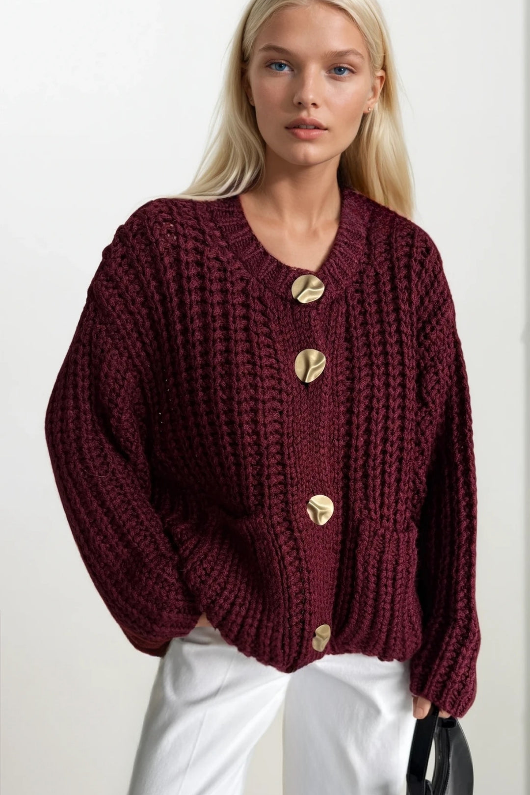 Çizgili Düğmeli Polo Yaka Bordo Triko Bluz