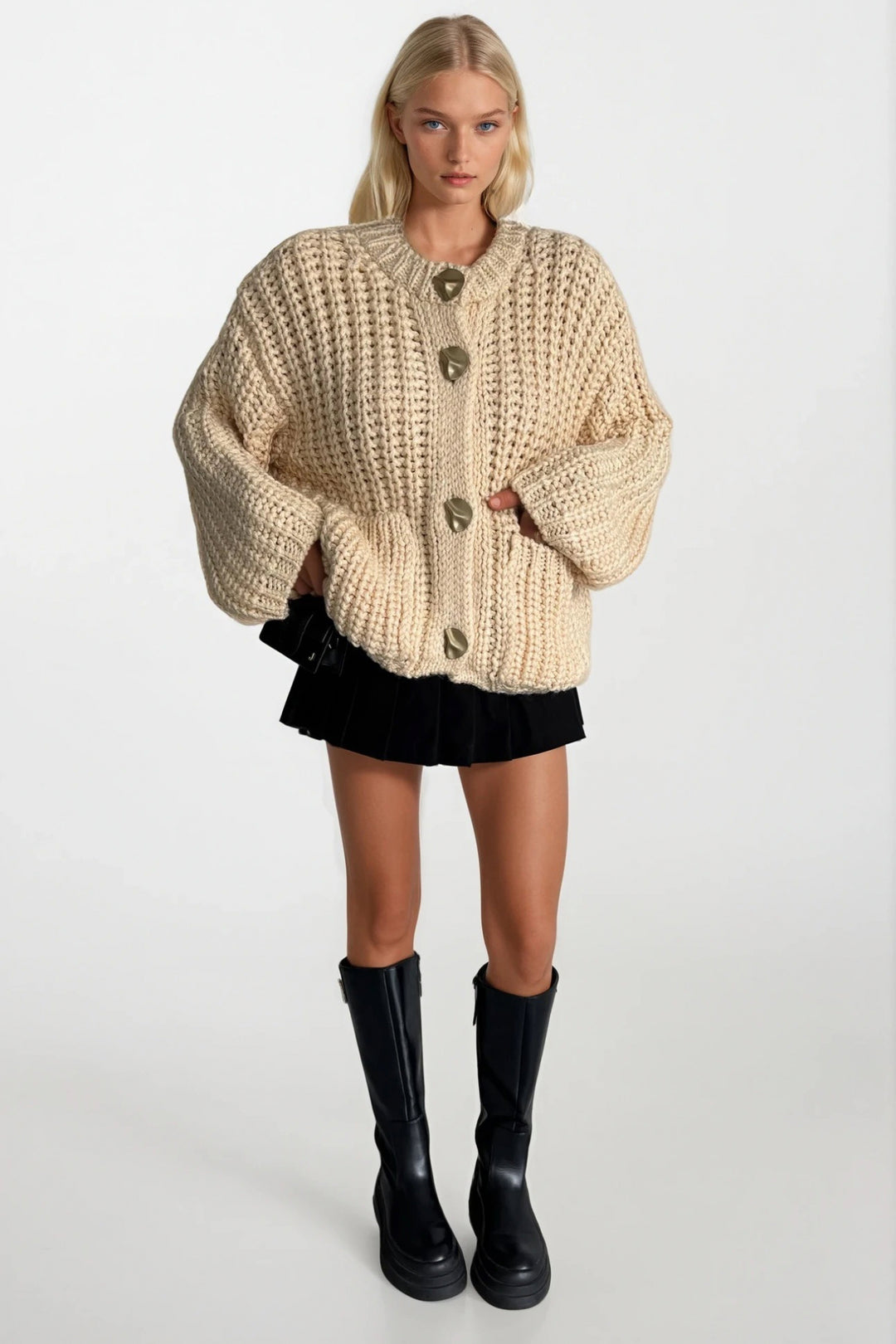 Polo Yaka Ekru Düğmeli Triko Kazak