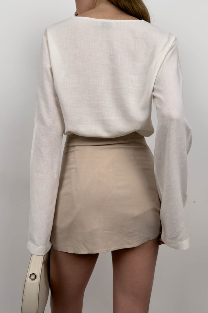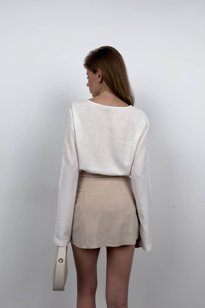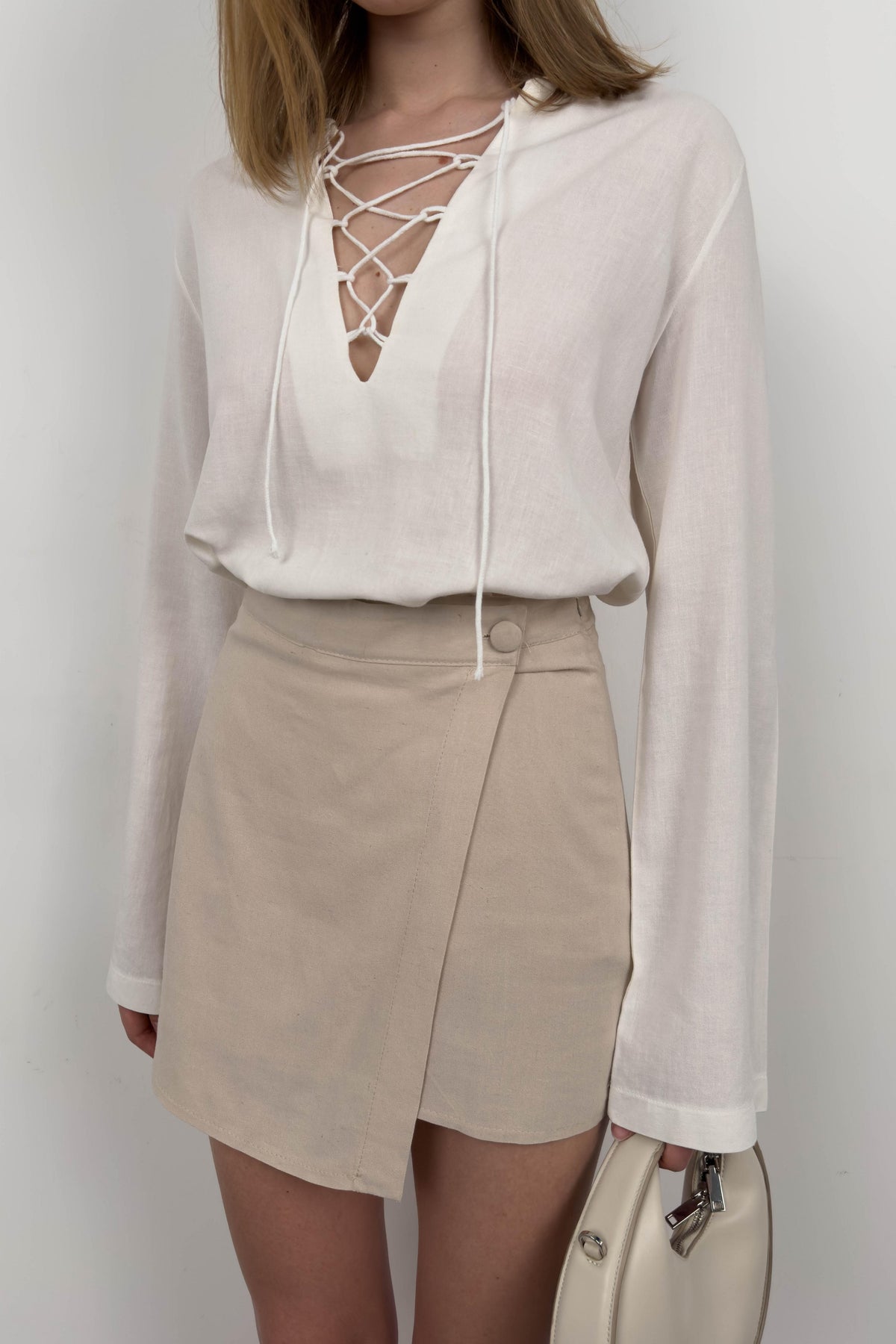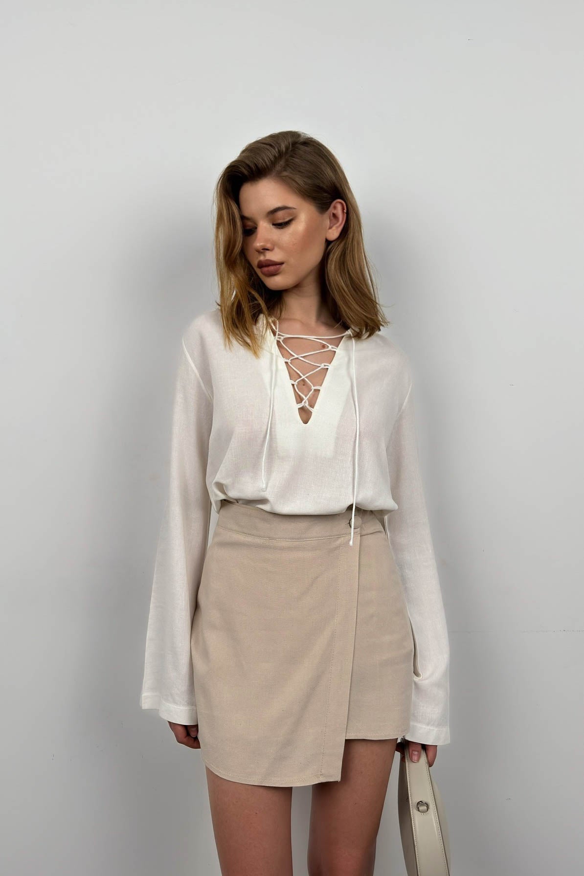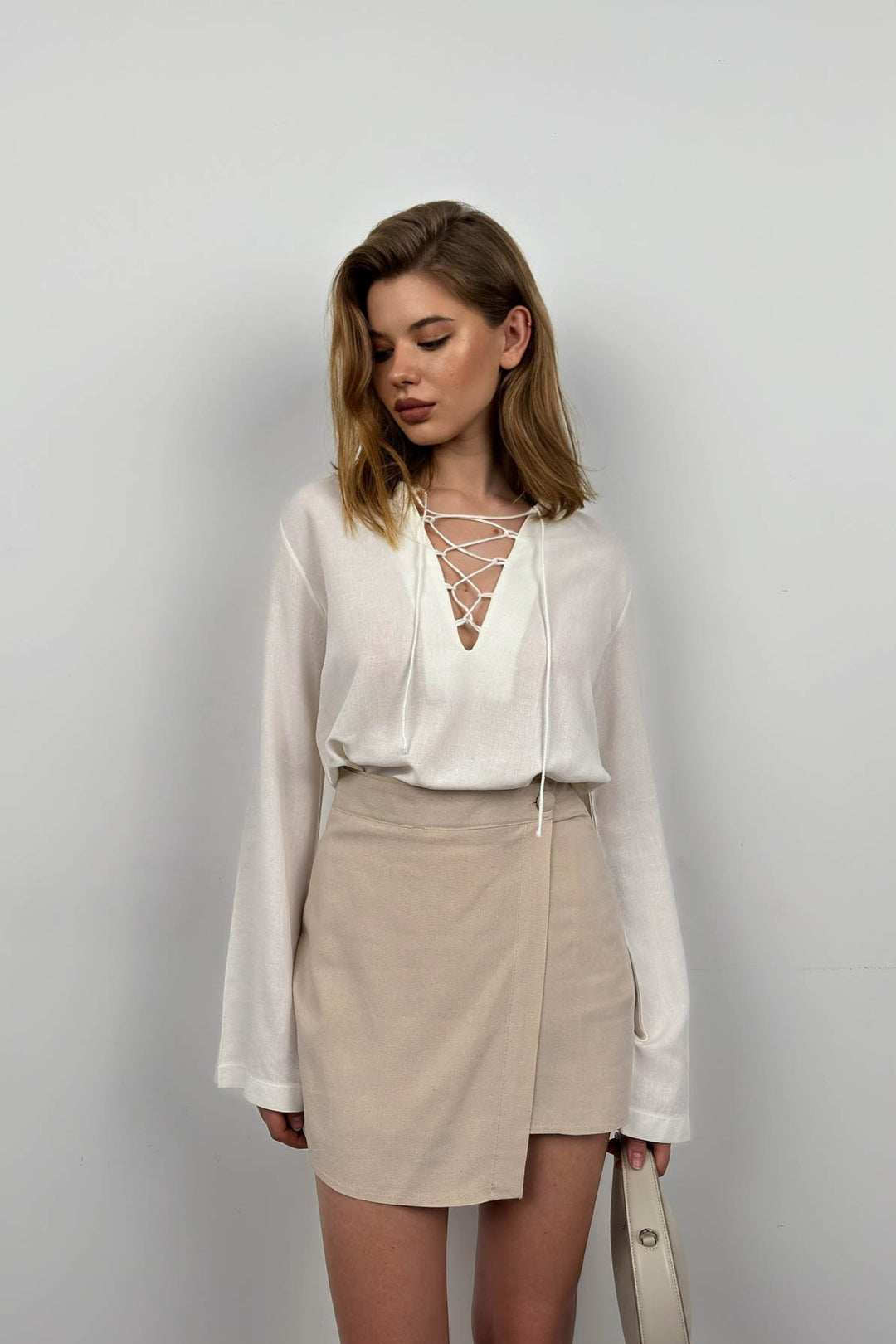 V Neck, Long Sleeve, Lace Up, Linen Blouse, Long Sleeve, Flare Sleeve, Regular Length