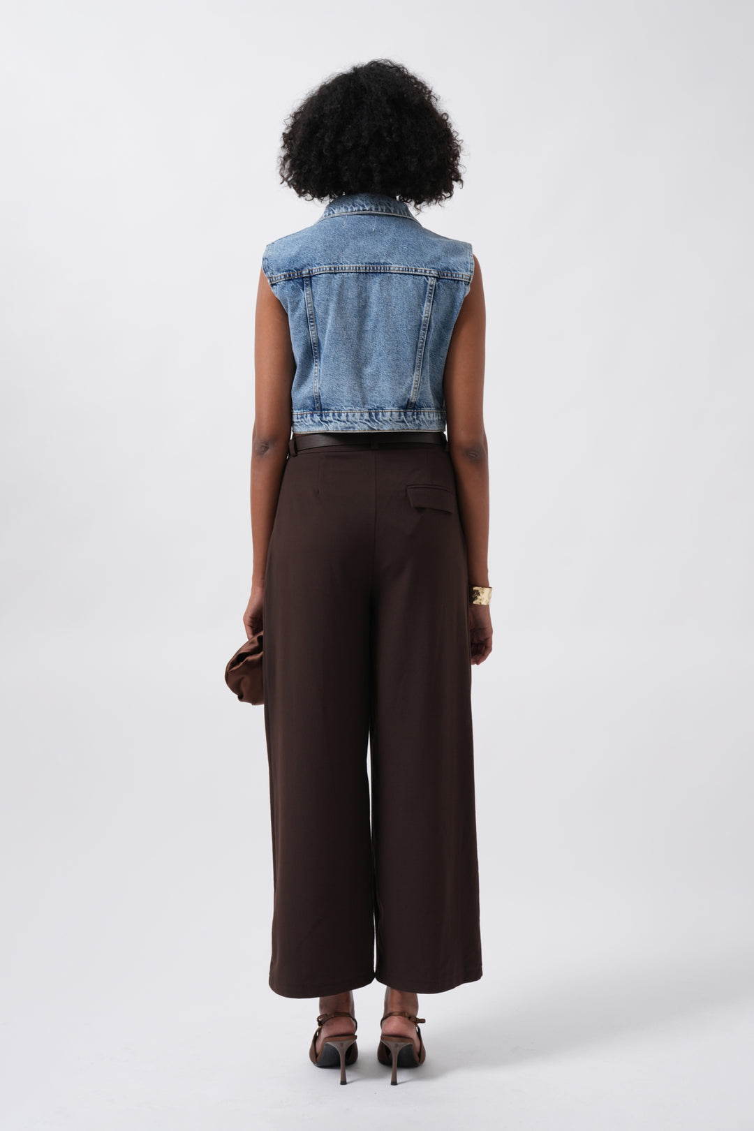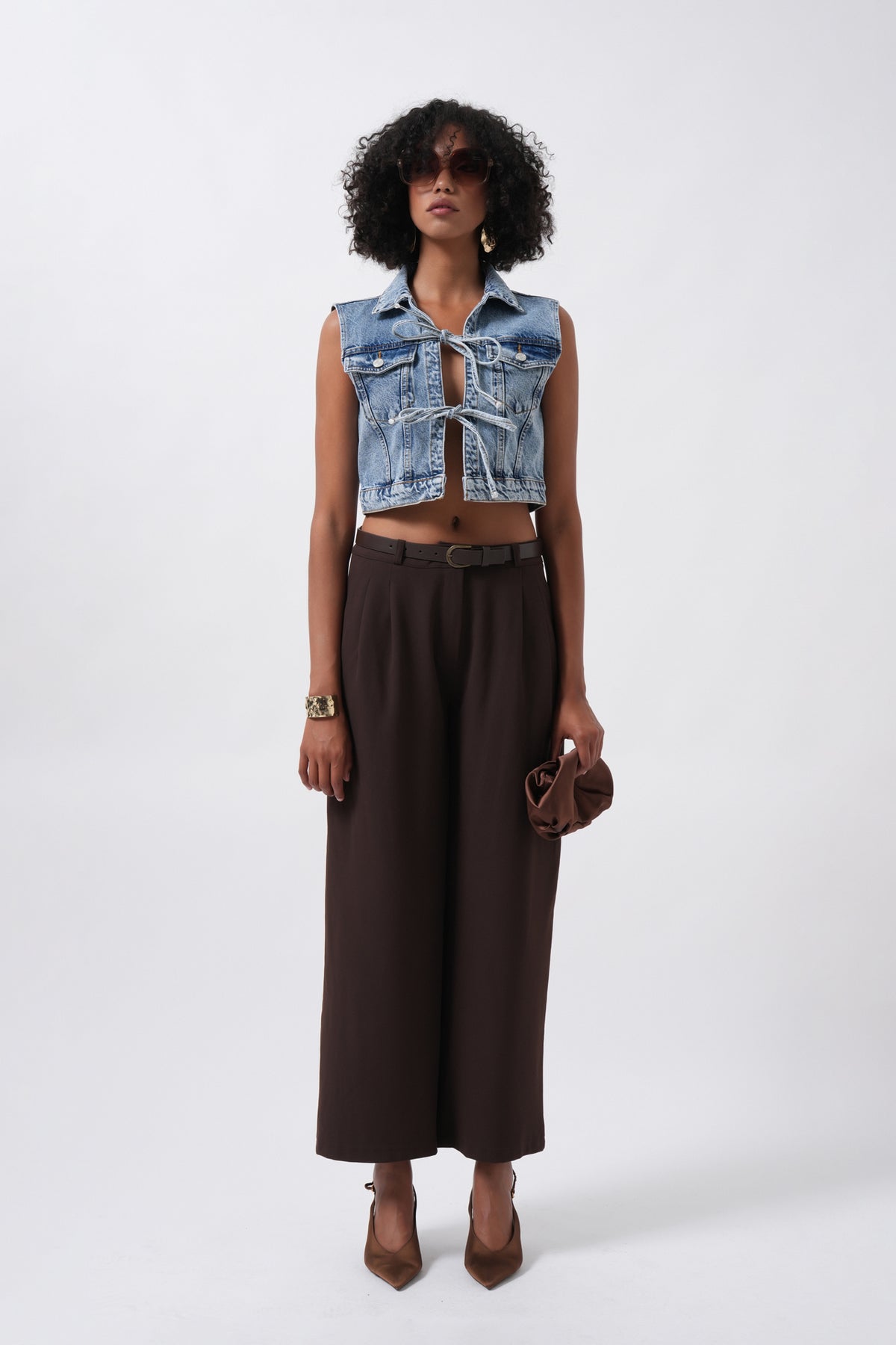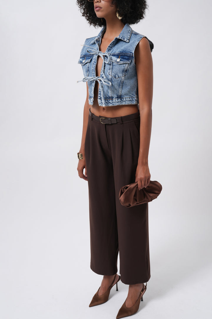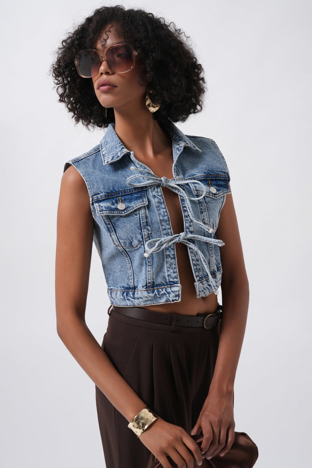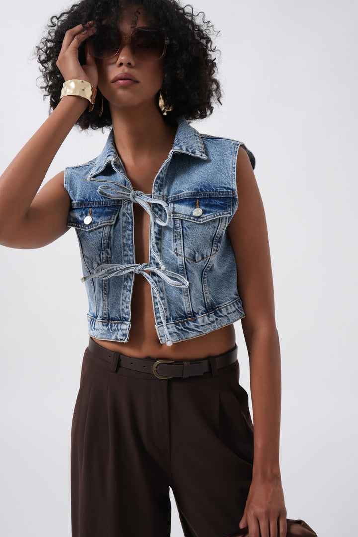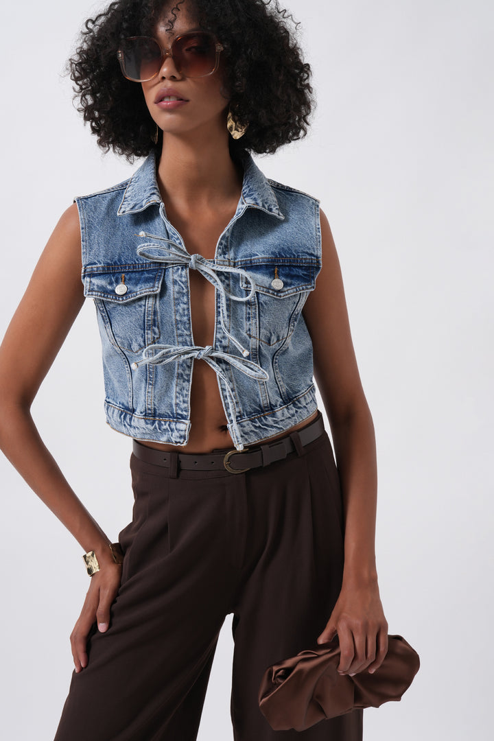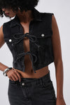 Shirt Collar Form, Bow Detailed Tie, Double Pocket, Double Button Denim Vest