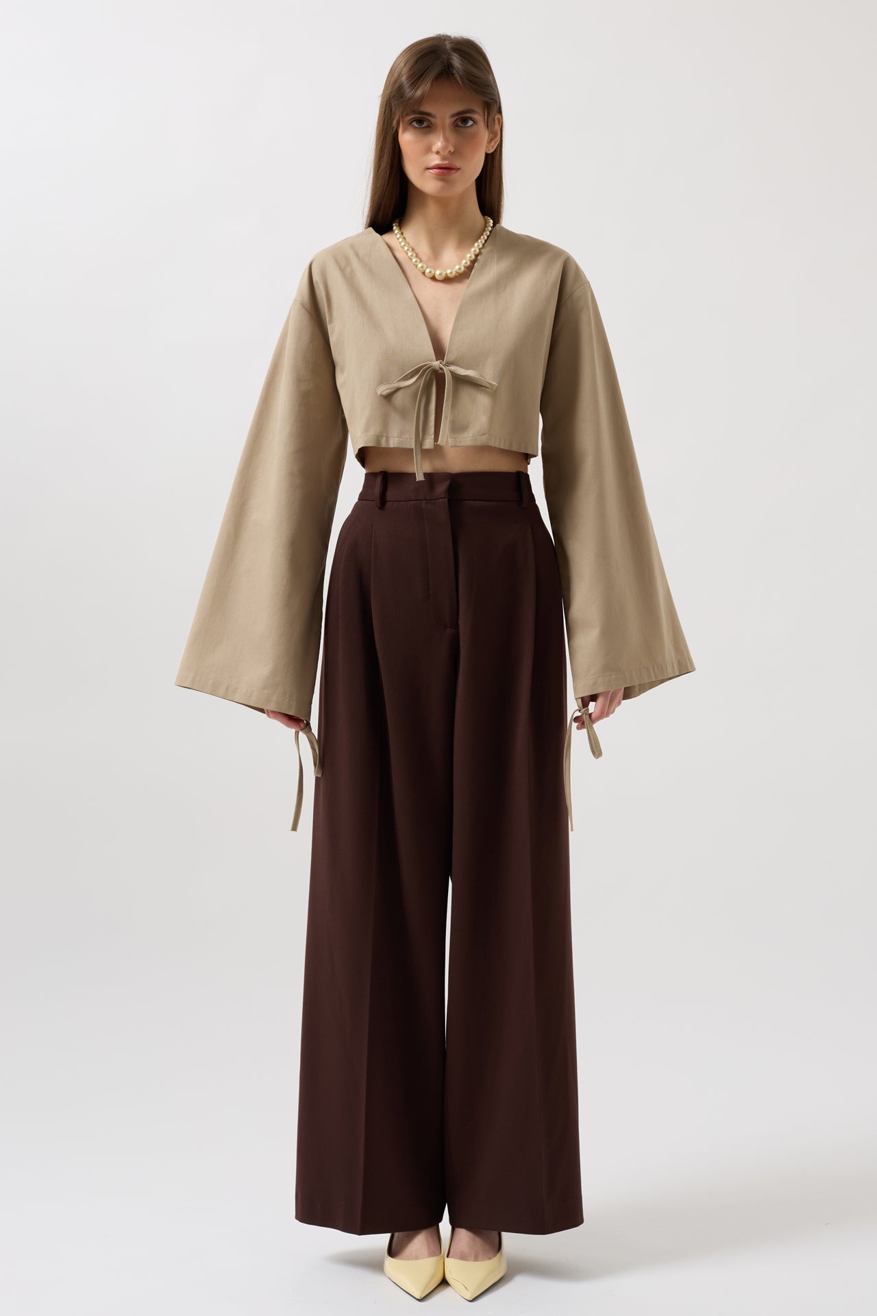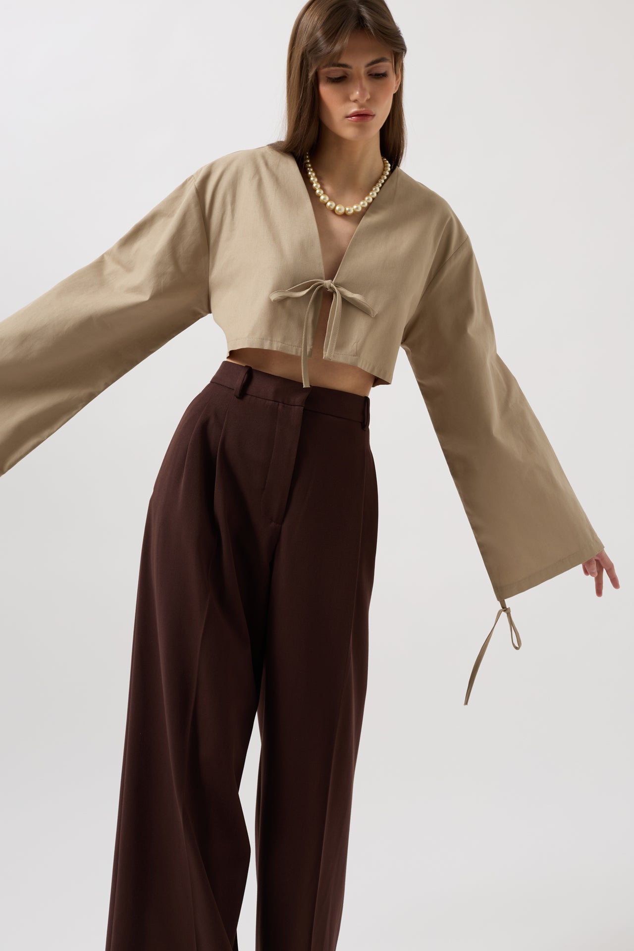 Tie Detail Long Sleeve Beige Blouse