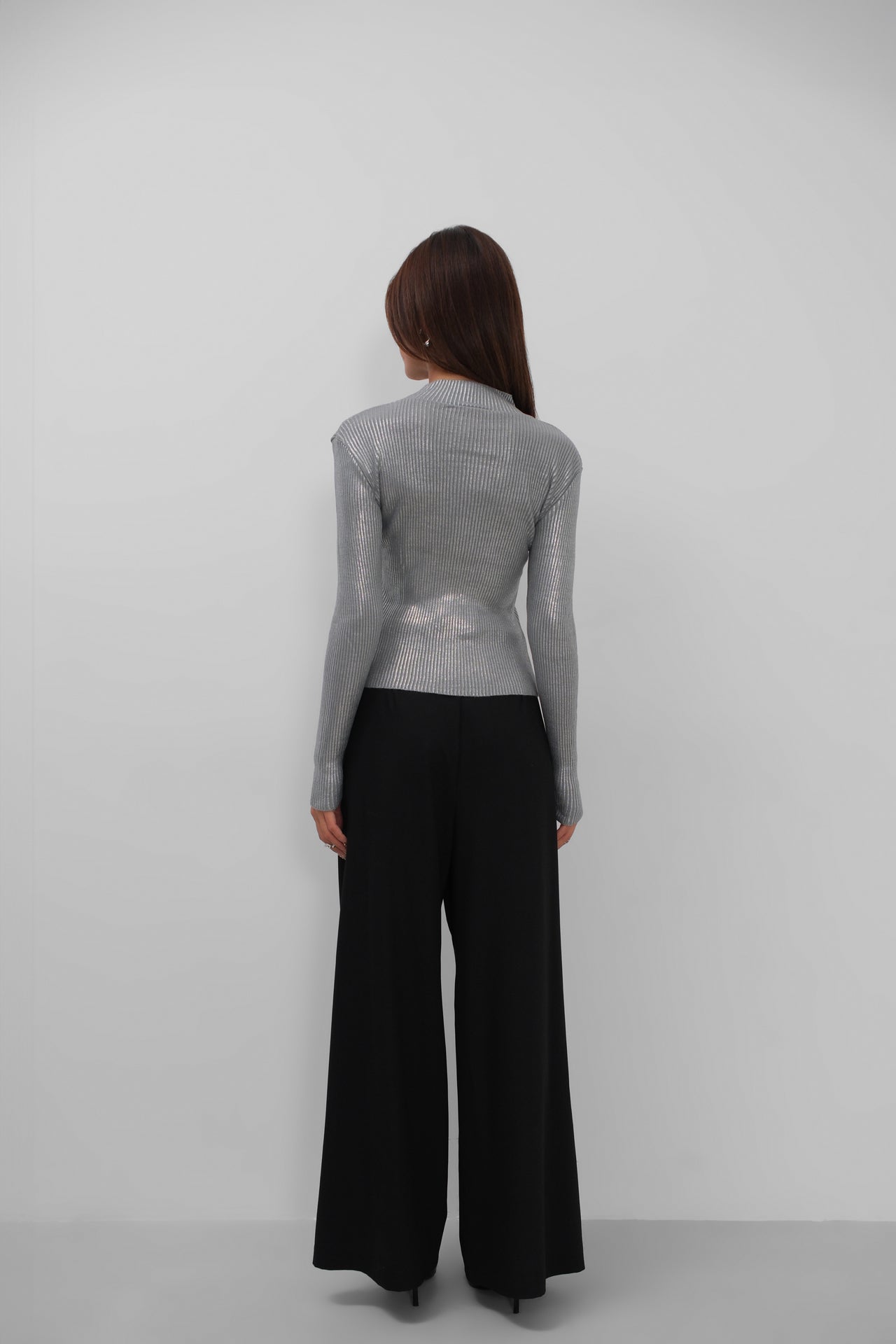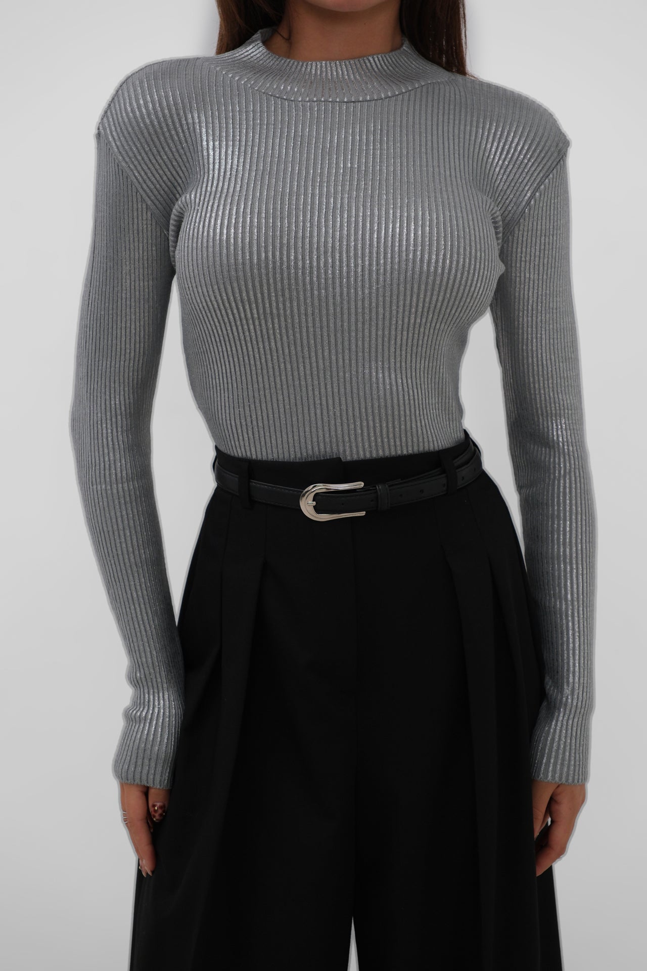 Shiny Fabric, Ribbed Texture, Body-hugging, Knitted Sweater Blouse