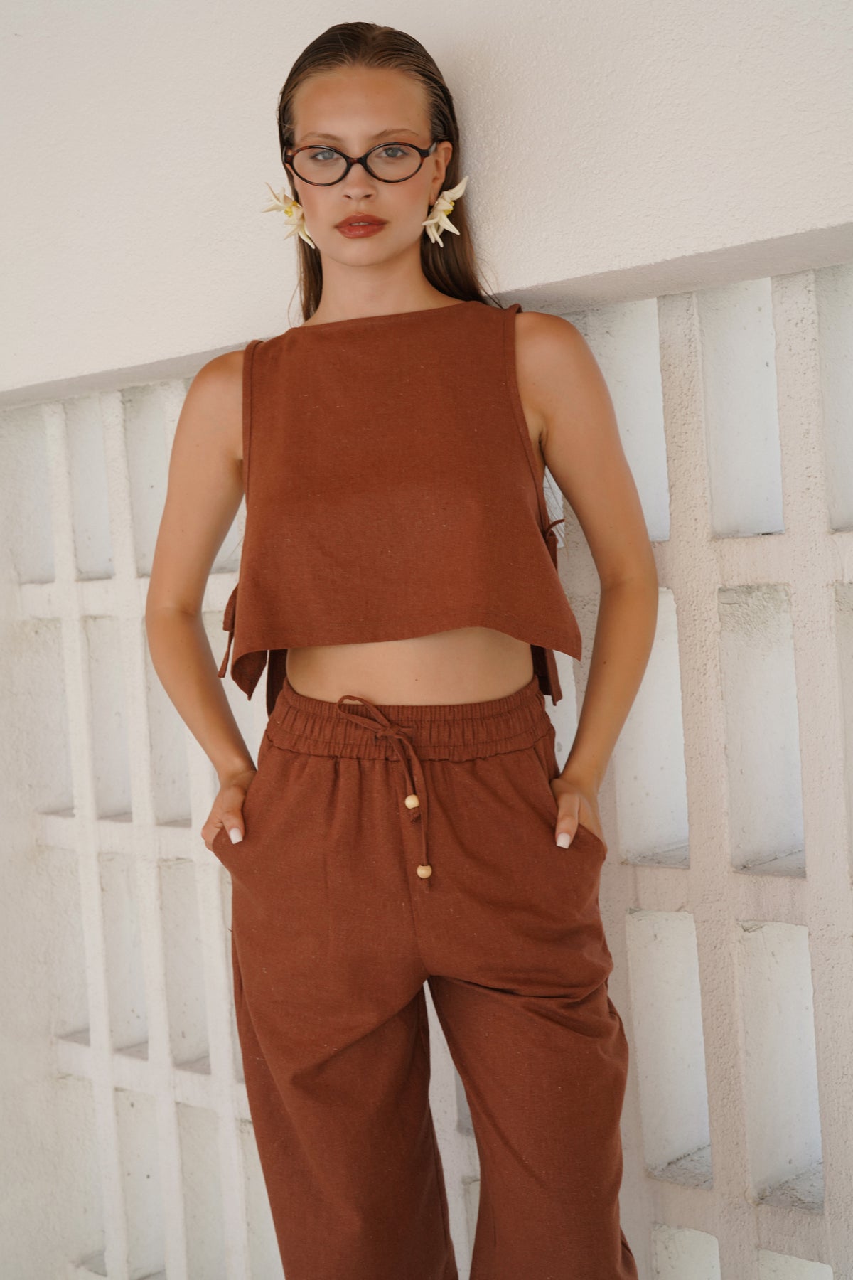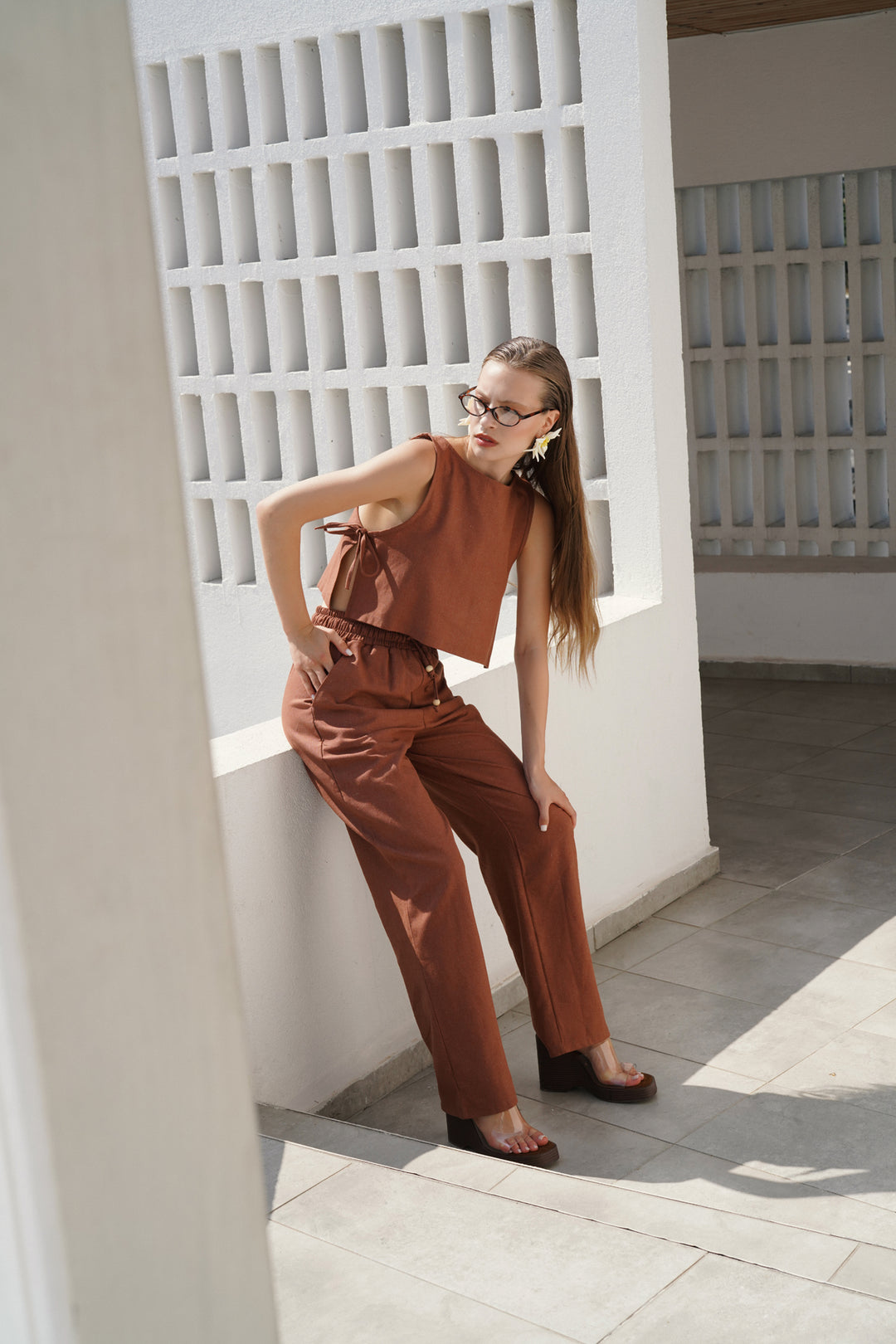 Elastic Waist, Lace Accessory Detail, Relaxed Cut, Linen Trousers