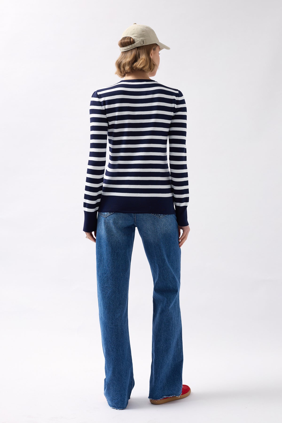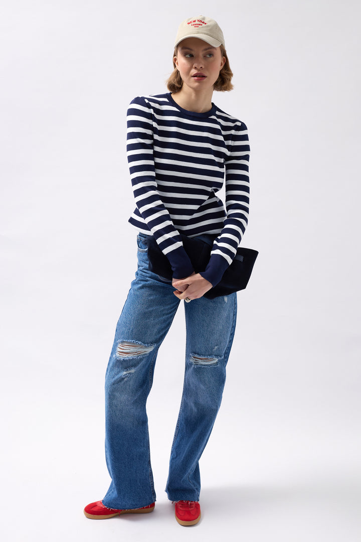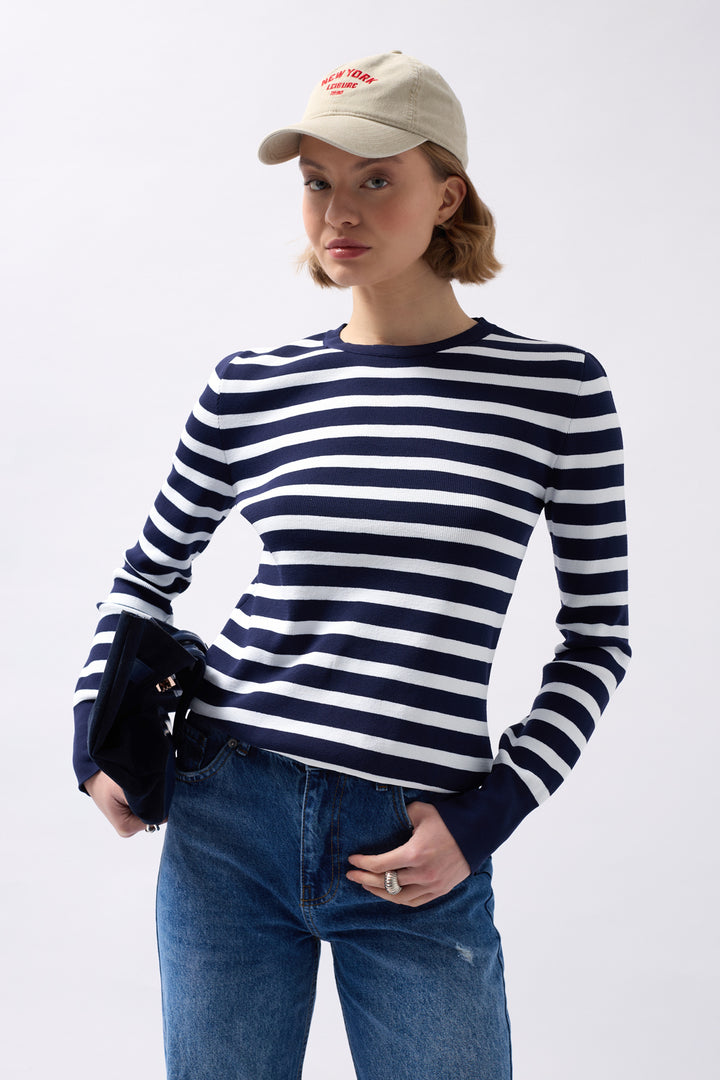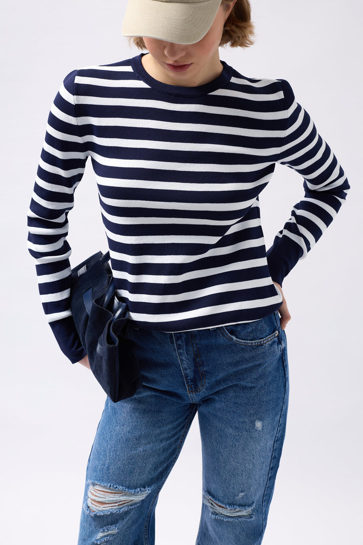 Crew Neck Striped White-Navy Blouse