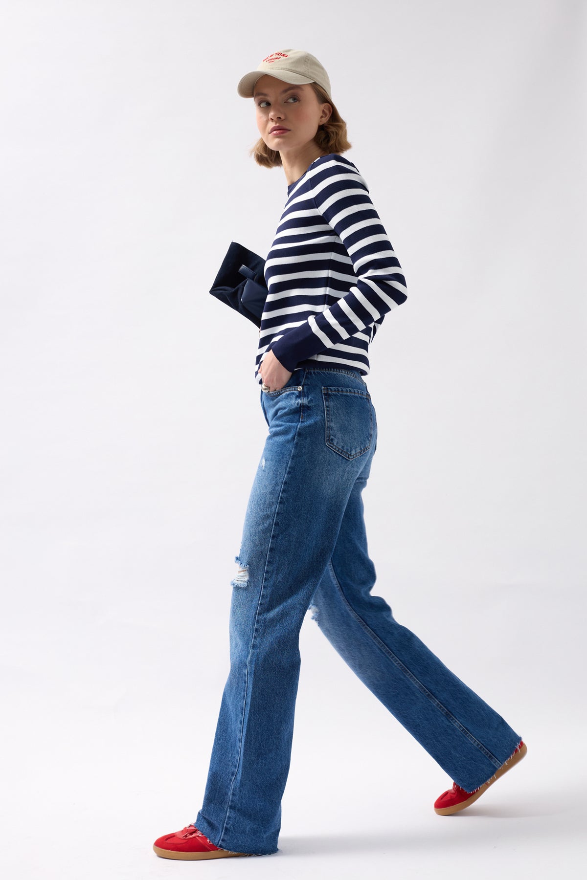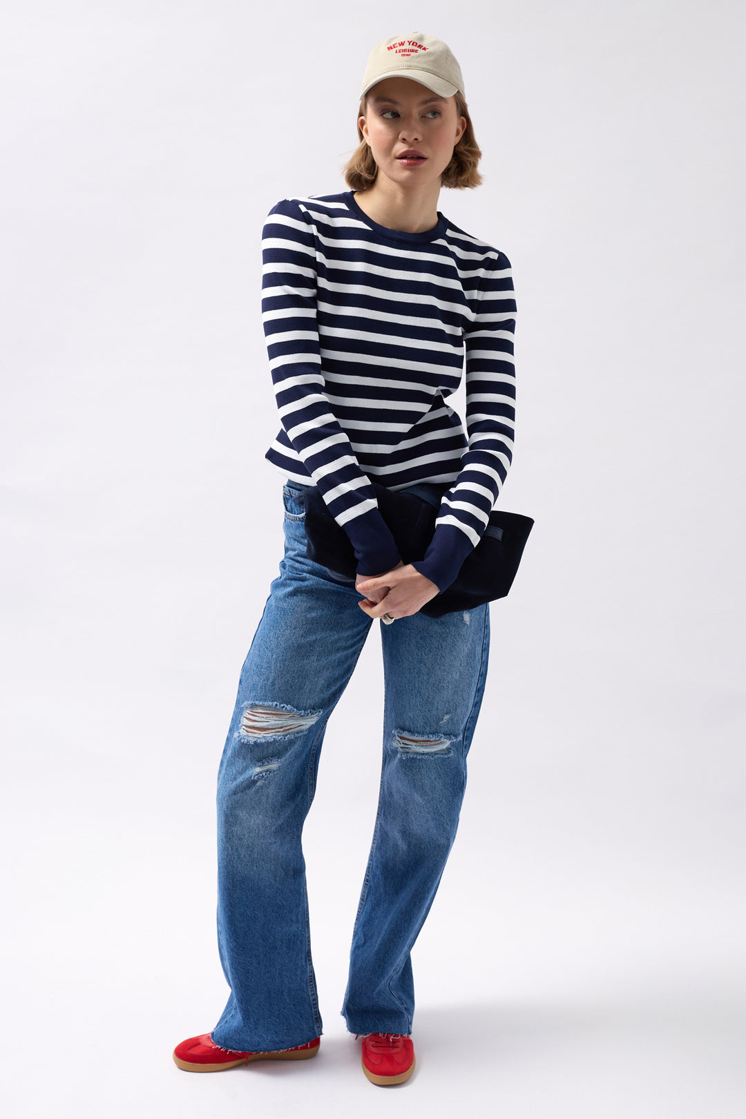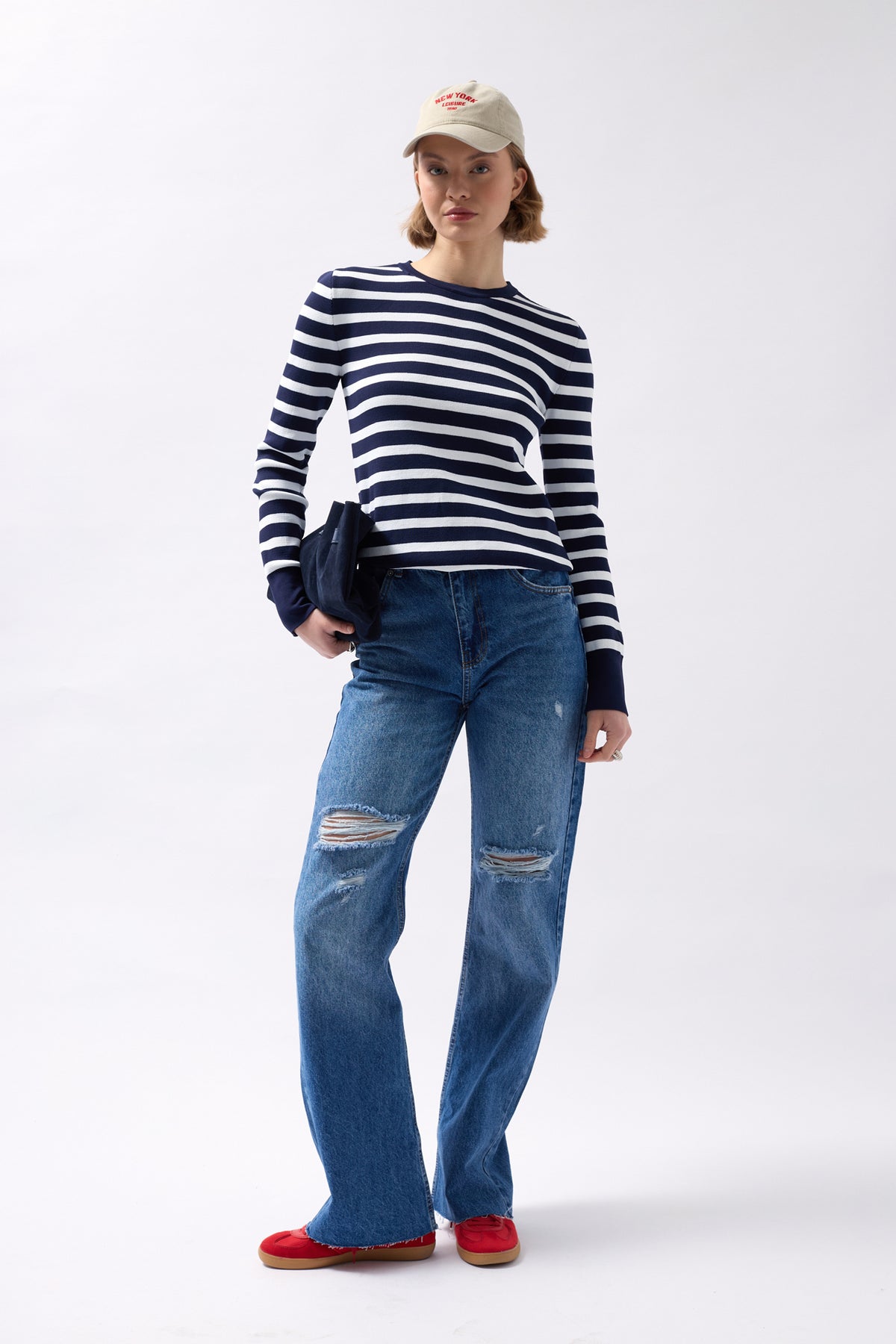 Crew Neck Striped White-Navy Blouse