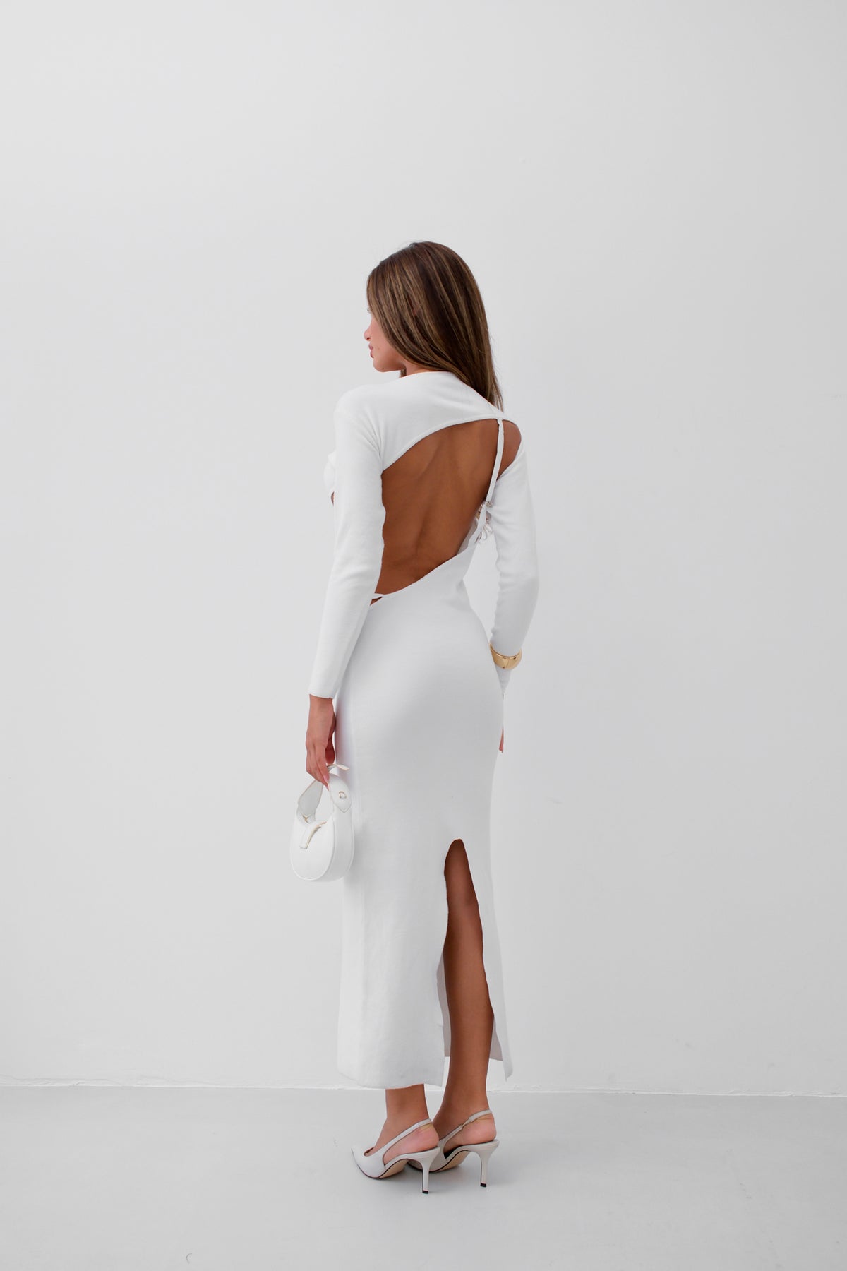 Crew Neck, Deep Back Cleavage, Long Sleeve, Body-Clinging, Midi Length, Dress