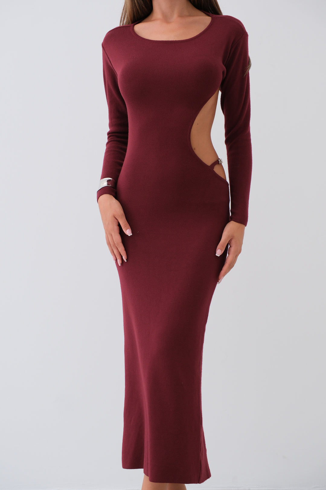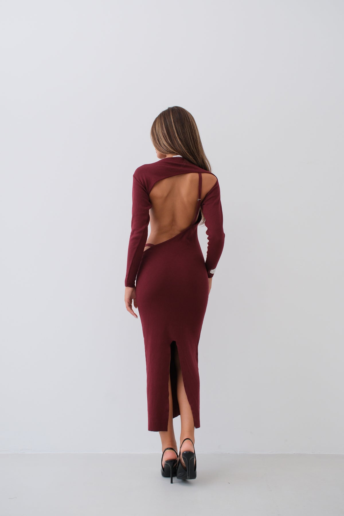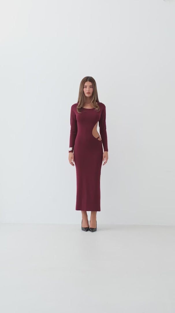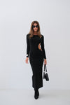 Crew Neck, Deep Back Cleavage, Long Sleeve, Body-Clinging, Midi Length, Dress