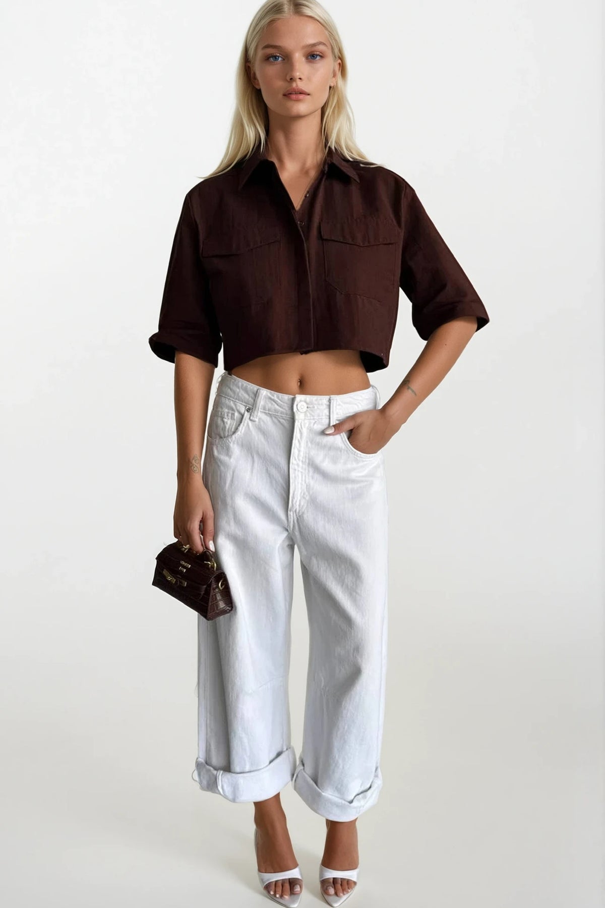Pocket Detail Half Sleeve Crop Linen Brown Shirt