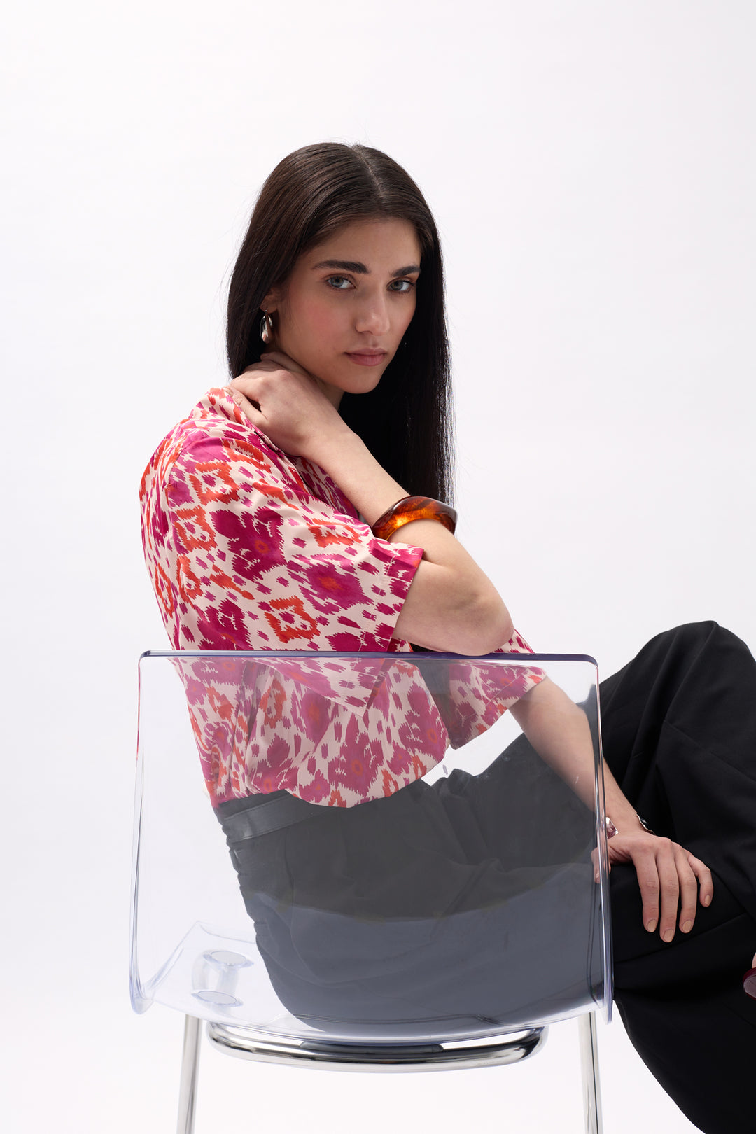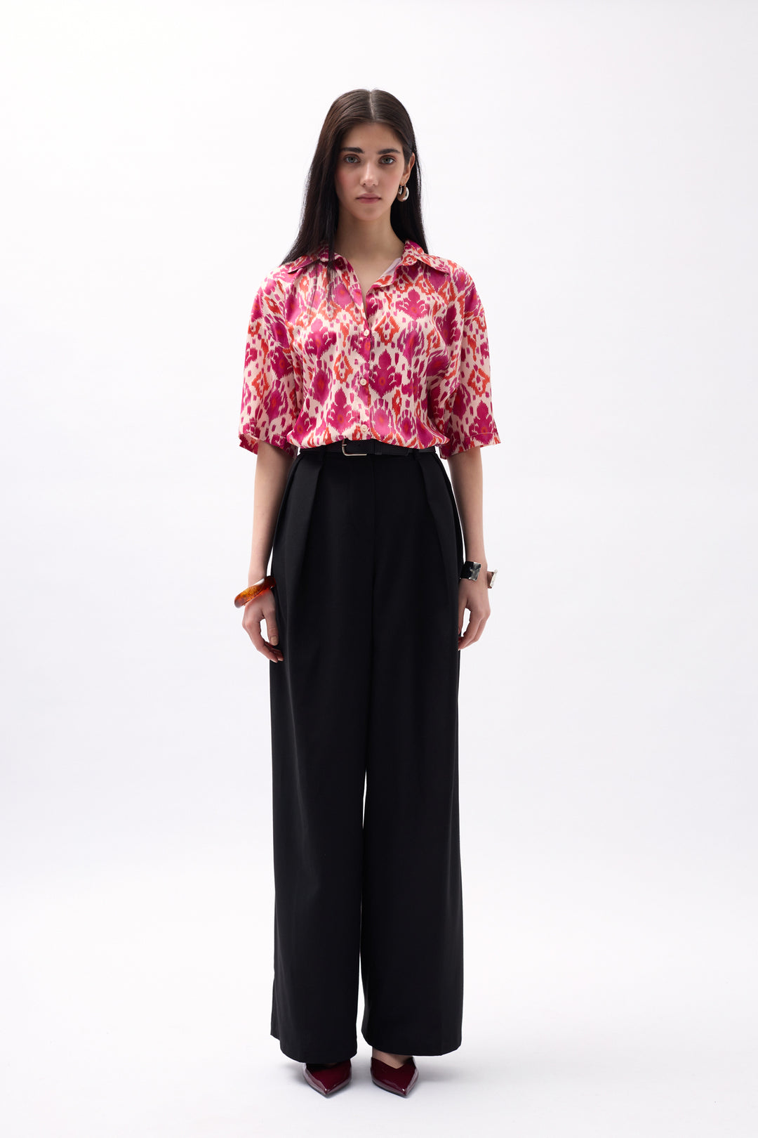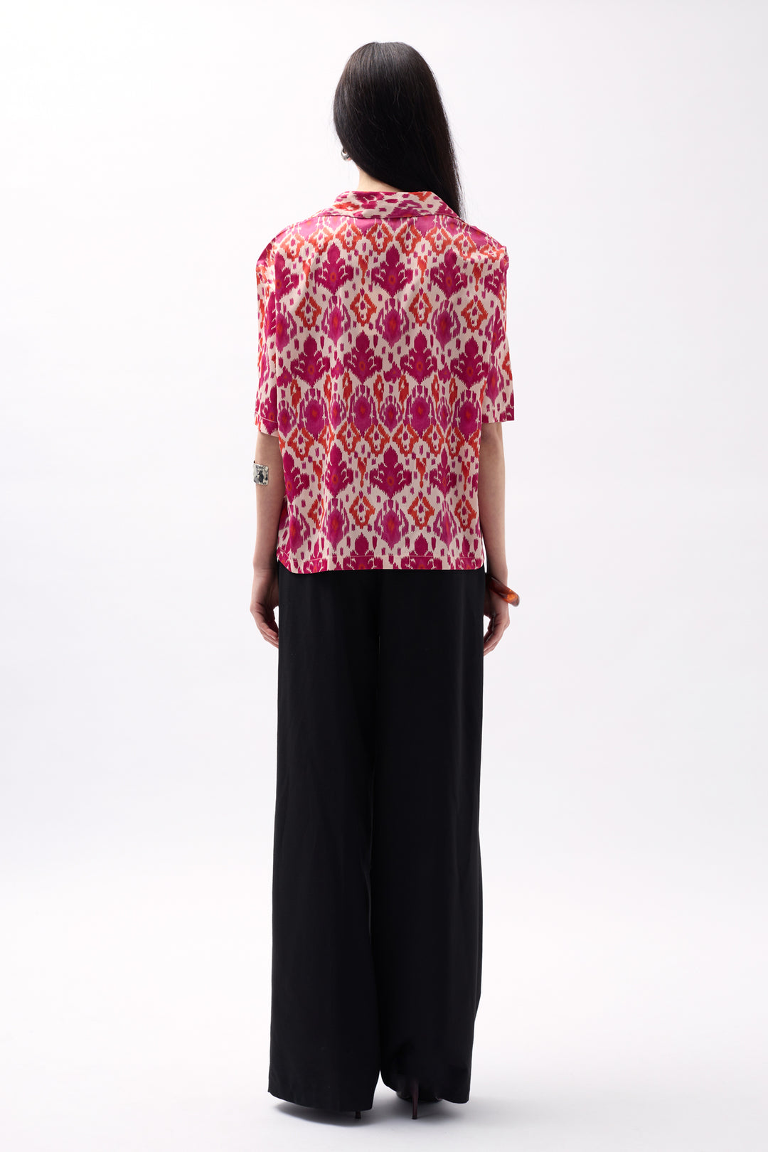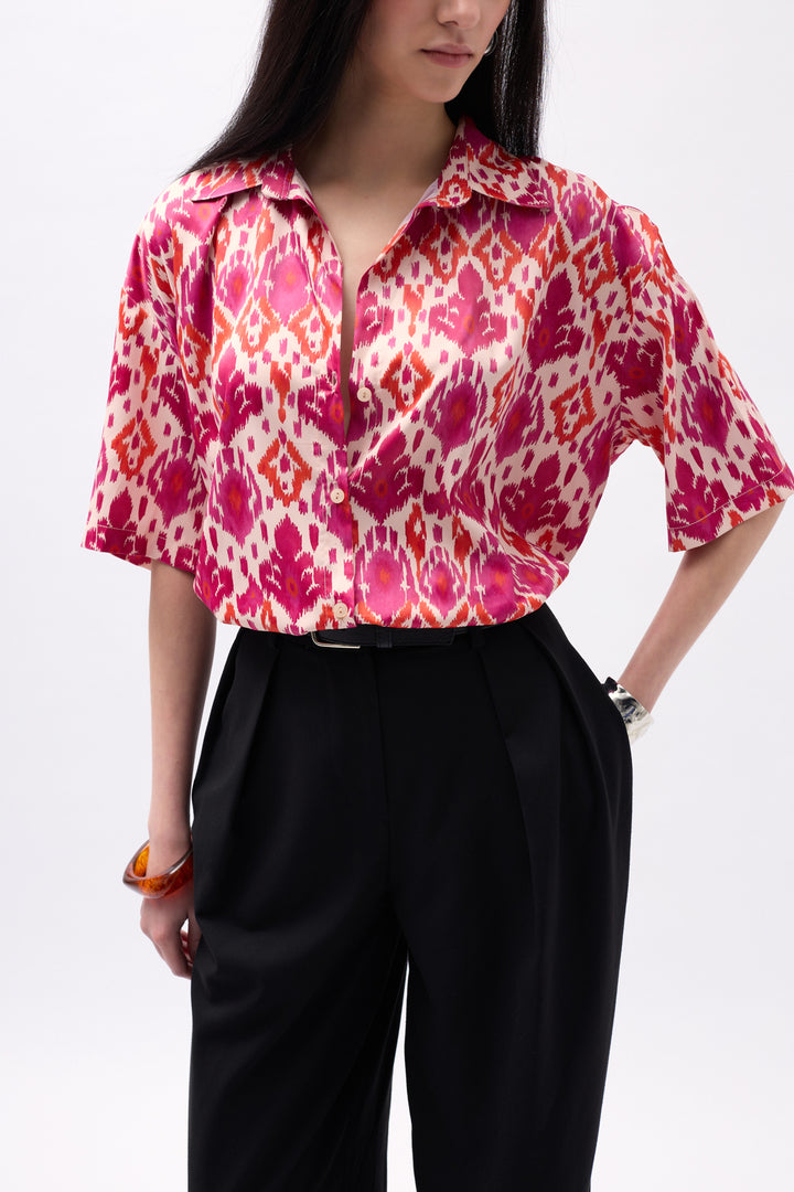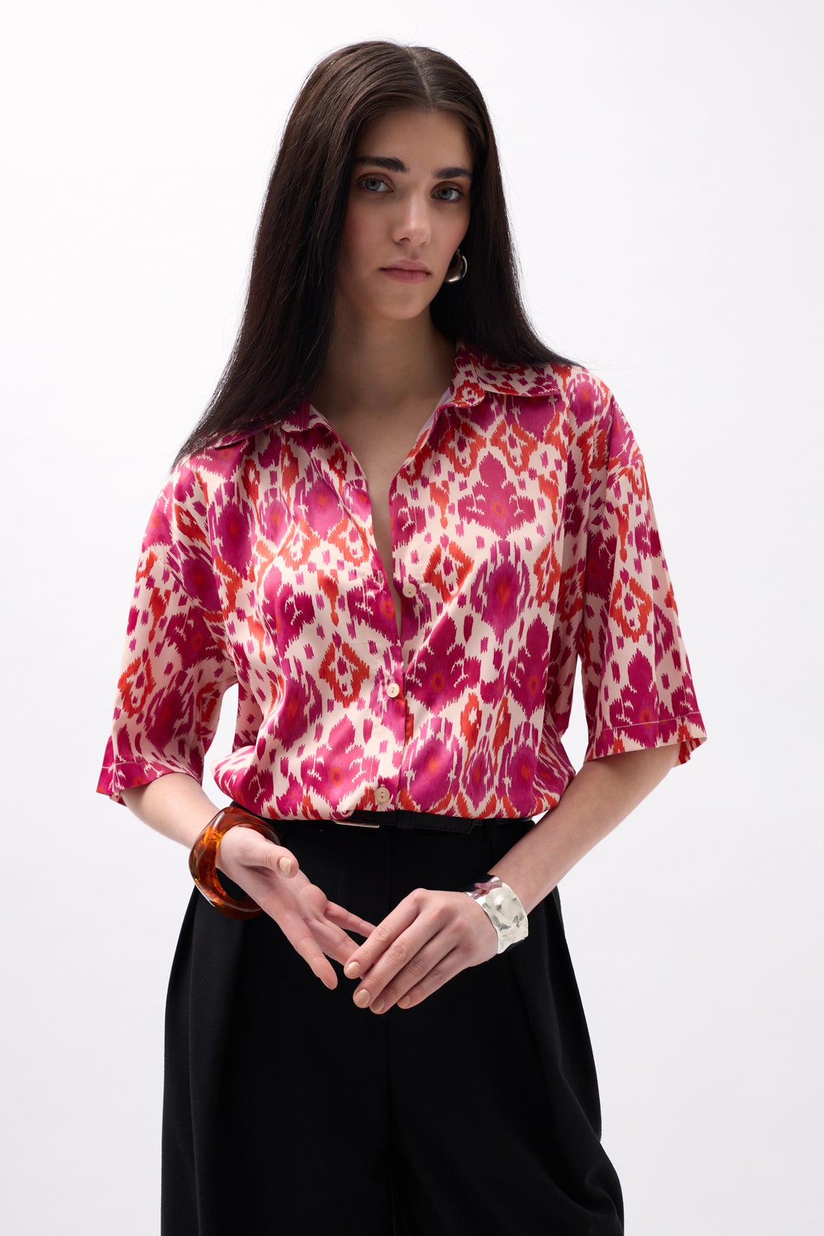 Patterned, Short Sleeve, Button Front, Jacket Collar, Regular Length, Satin Shirt