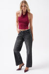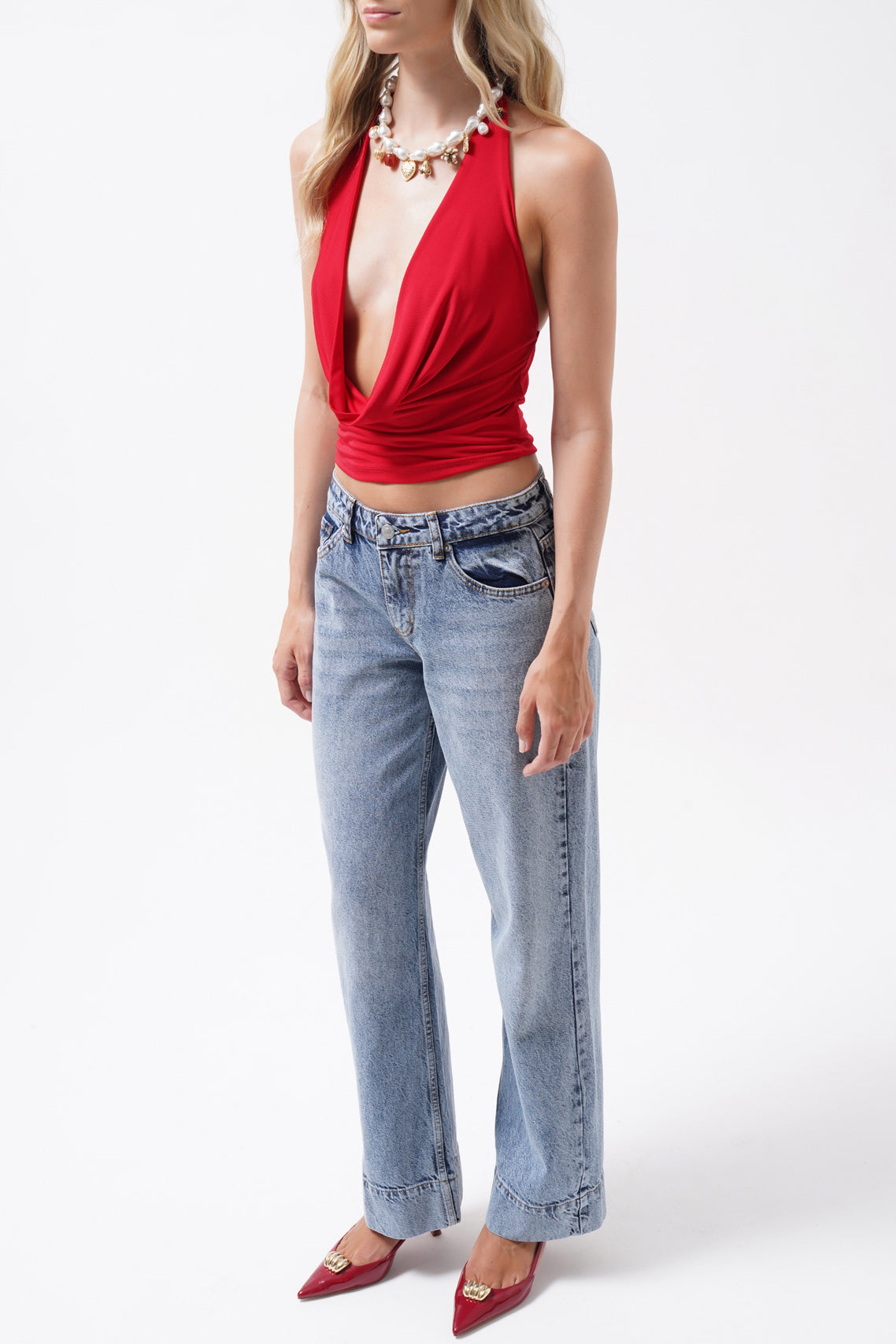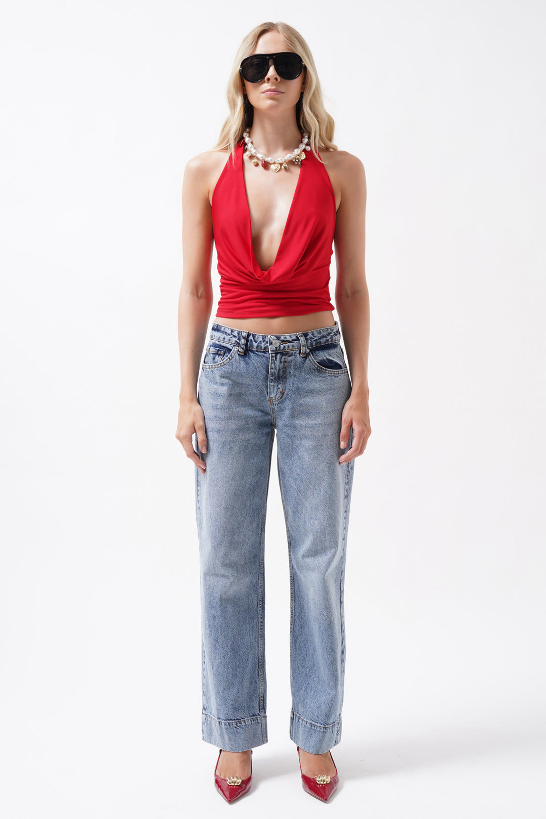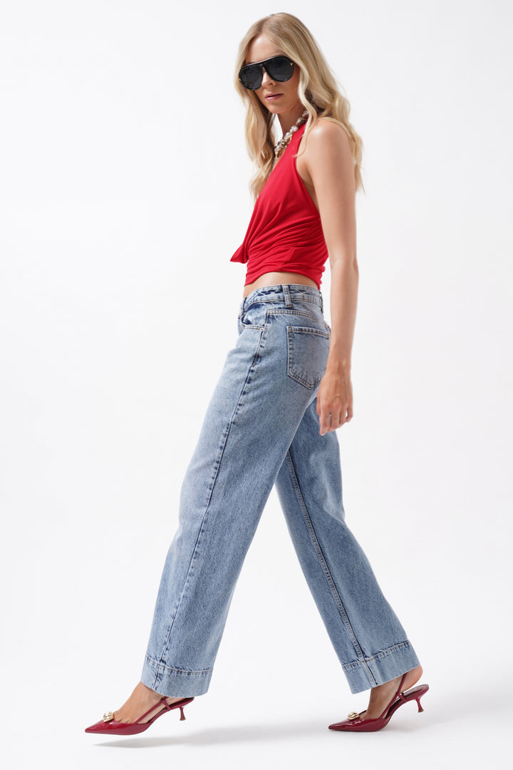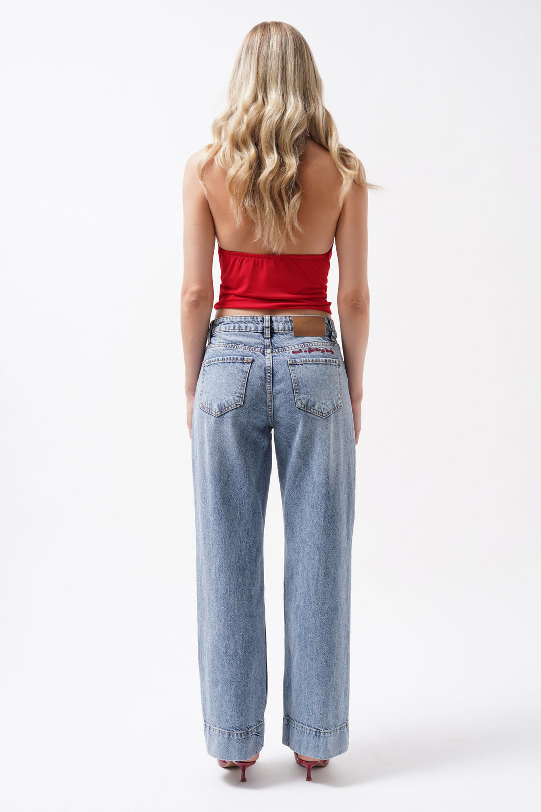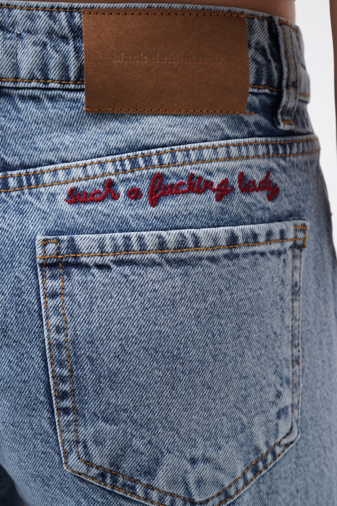 Double Leg Straight Jeans with Embroidery Detail on the Back, Five Pockets, Buttons and Zippers