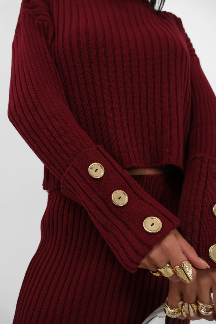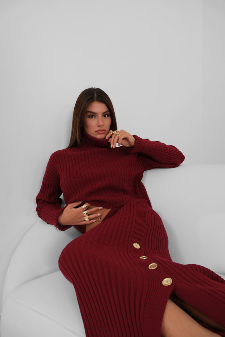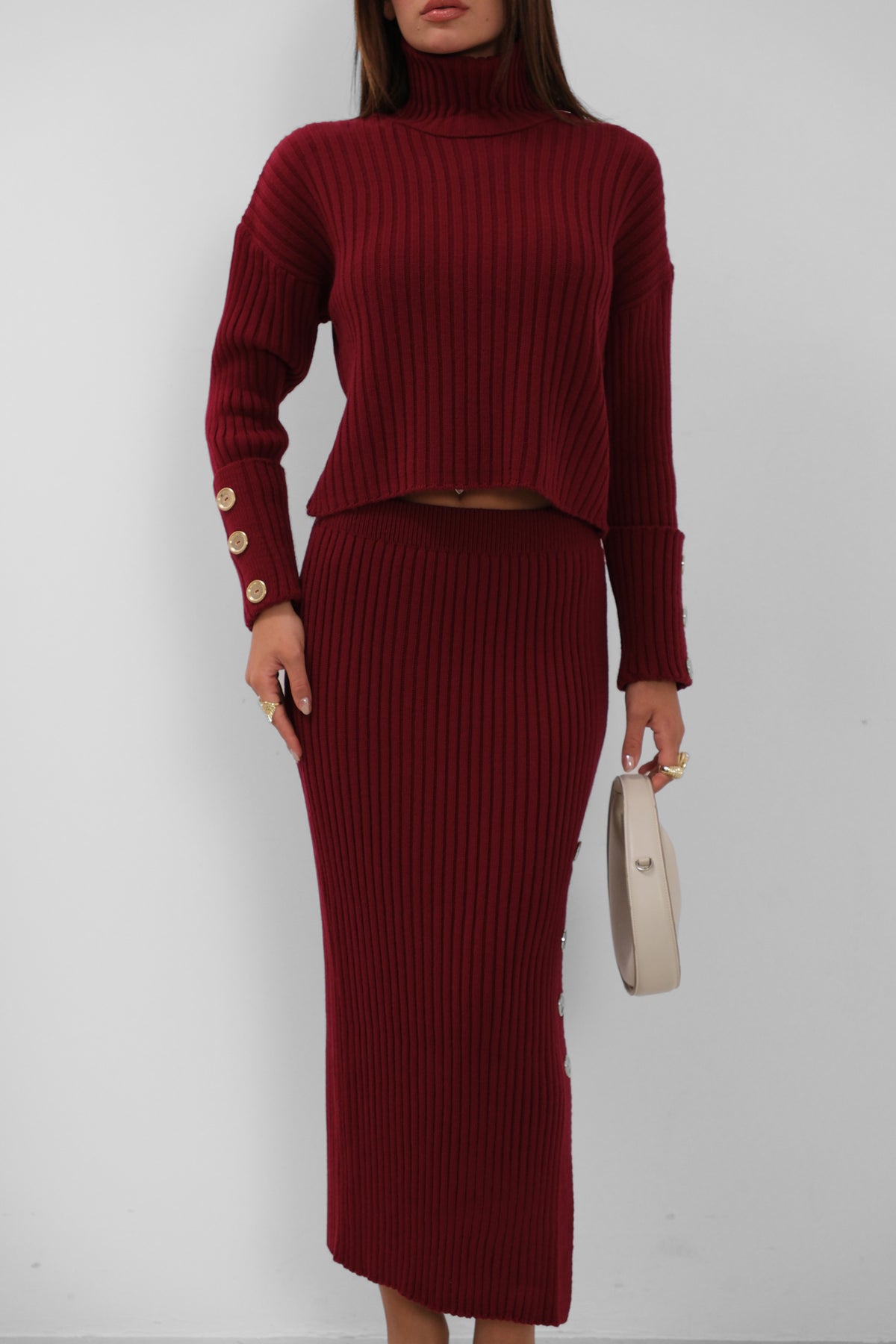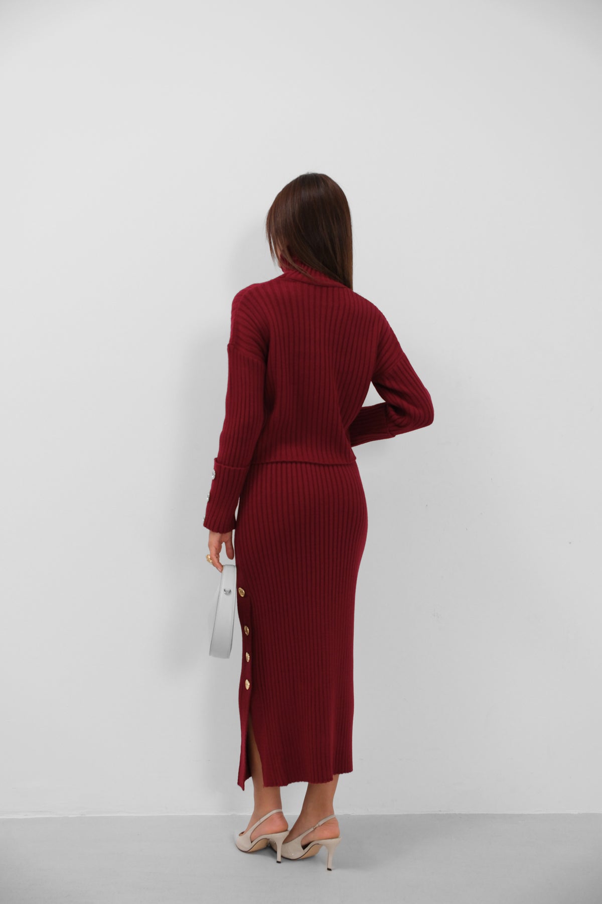 Button Detailed Turtleneck Sweater and Skirt Burgundy Knitwear Set